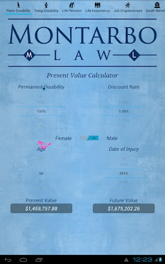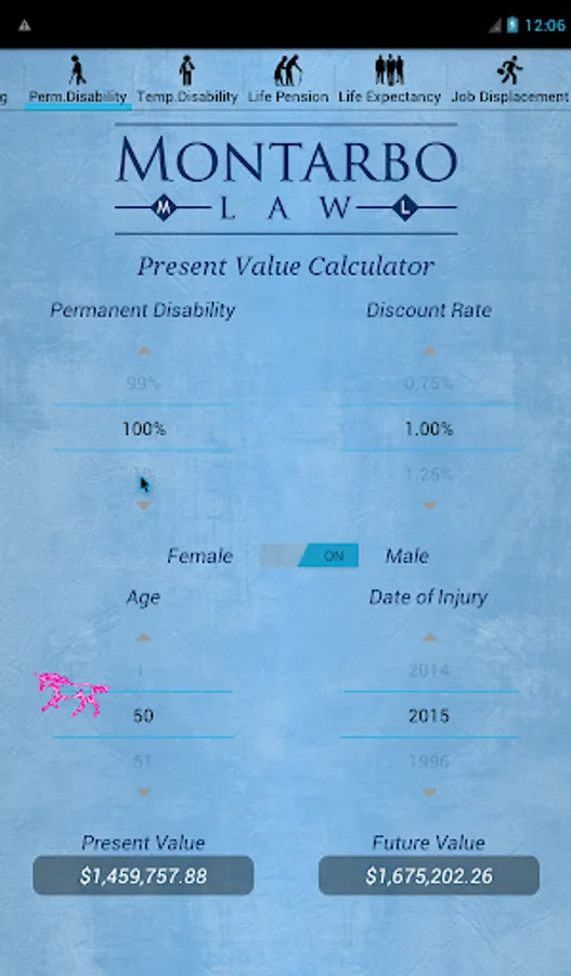 The CompCalc Plus also provides a PV/FV calculation of 100% PD based upon age, gender, and a given discount rate.