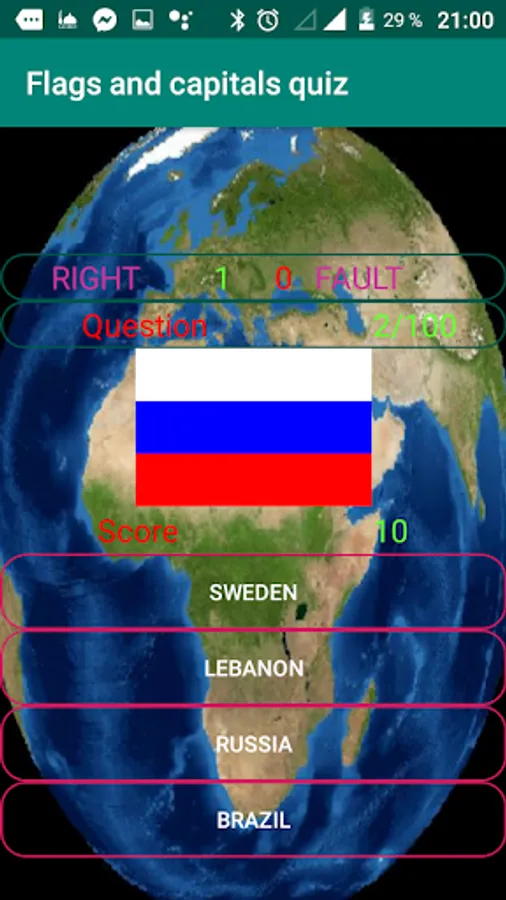 This is an excellent and fun quiz game for all students of world geography. Or are you a sports fan who needs help to recognize the flags of national teams? Find the national flag of your state and learn other flags by heart! and all capitals of the world !