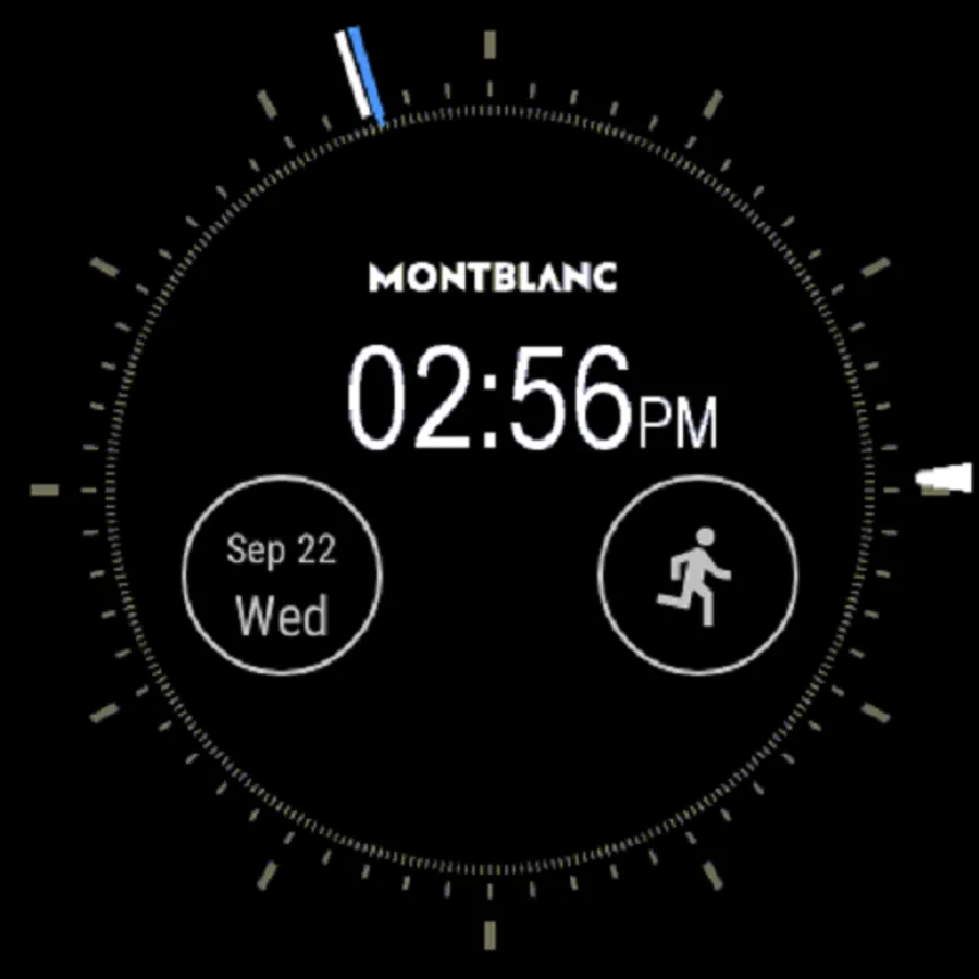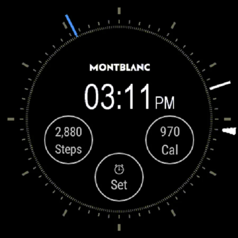 Montblanc's Urban watch face displays the time in a modern and stylish way with revised numerals and hands. The three complications in the center can be customized to indicate anything from steps taken to the current temperature, or to initiate actions such as setting an alarm or initiating a contactless payment.