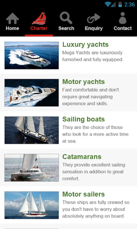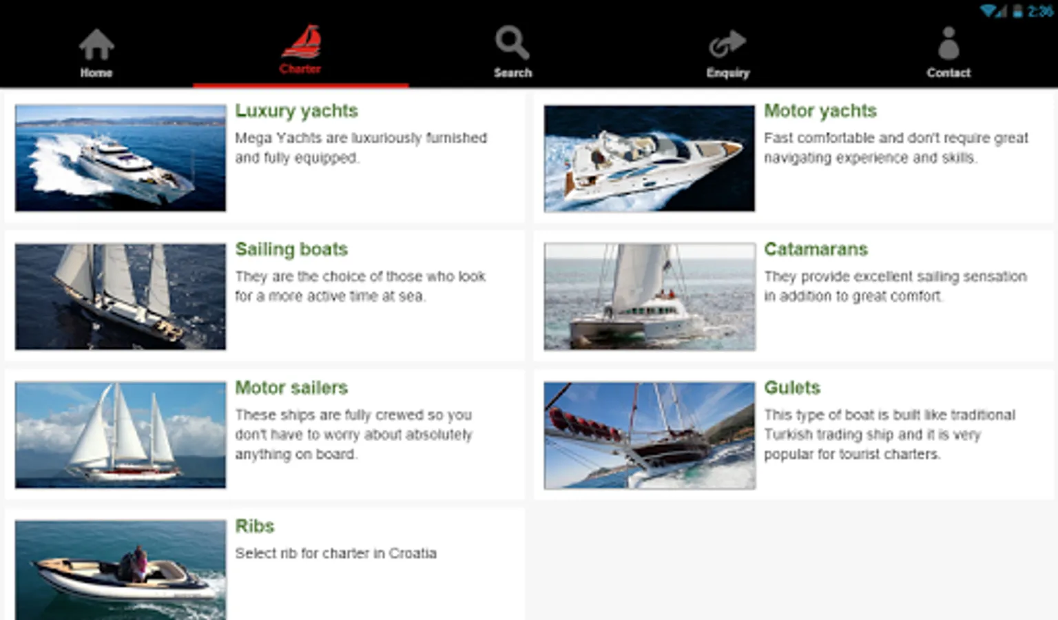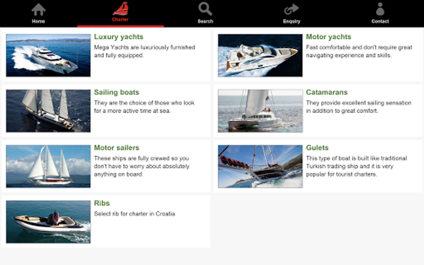 - Yacht listing (luxury yachts, motor yachts, sailing boats, catamarans, gulets/motorsailers)