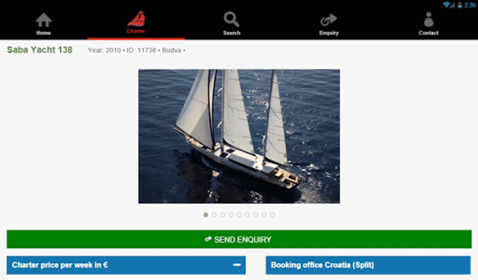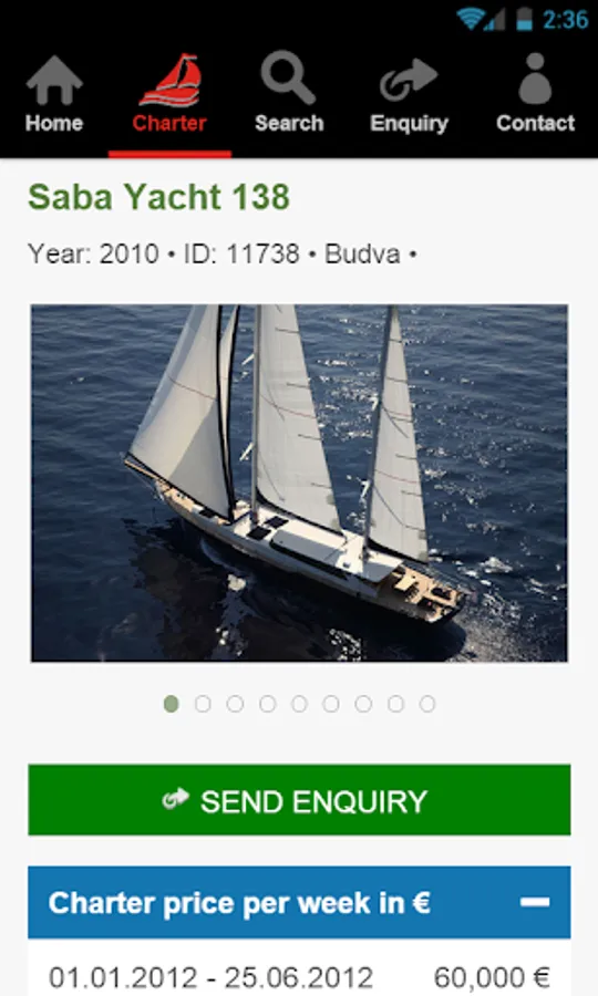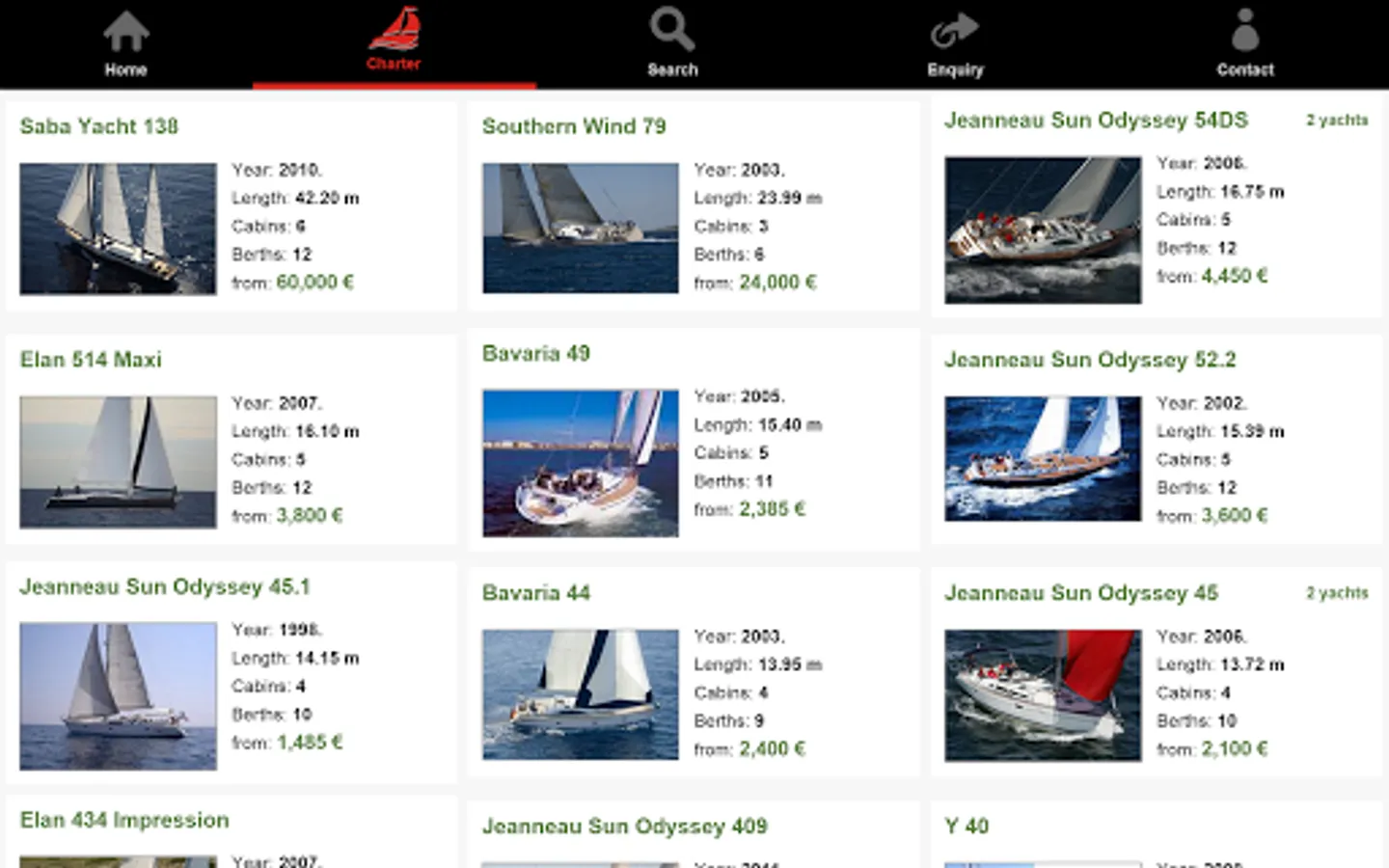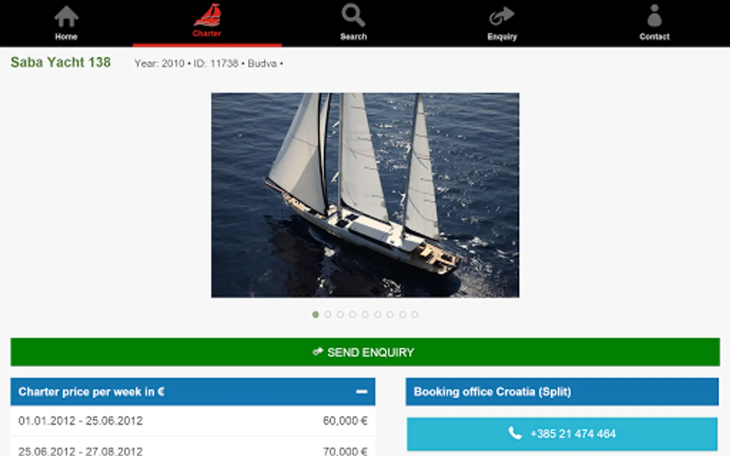 - Detailed yacht info (gallery, inventory list and technical specification, rental prices specified per periods)