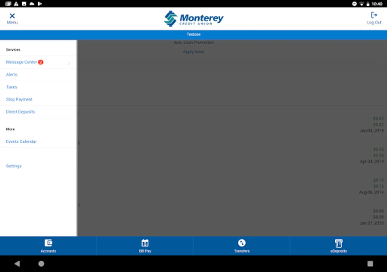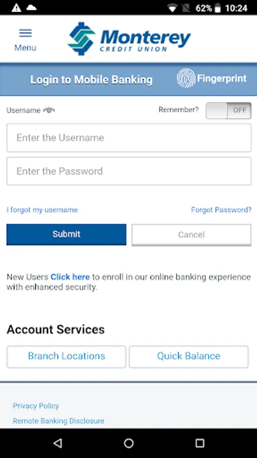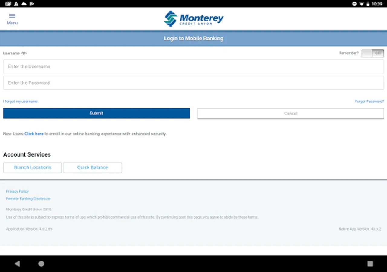 -Pay Bills -Mobile Deposit -Secure Messaging -Secure Multi-factor authentication -GPS-enabled location search to look up branch and ATM locations Please visit www.montereycu.com or call Member Services during normal business hours for further details.