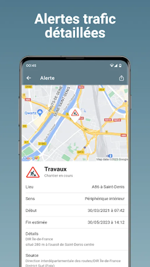 The data comes from official sources thanks to open data: we collect information from Bison Futé, which is attached to the public ministry responsible for transport. Thus, you have traffic information as precise as Bison Futé, the official source of road information in France.