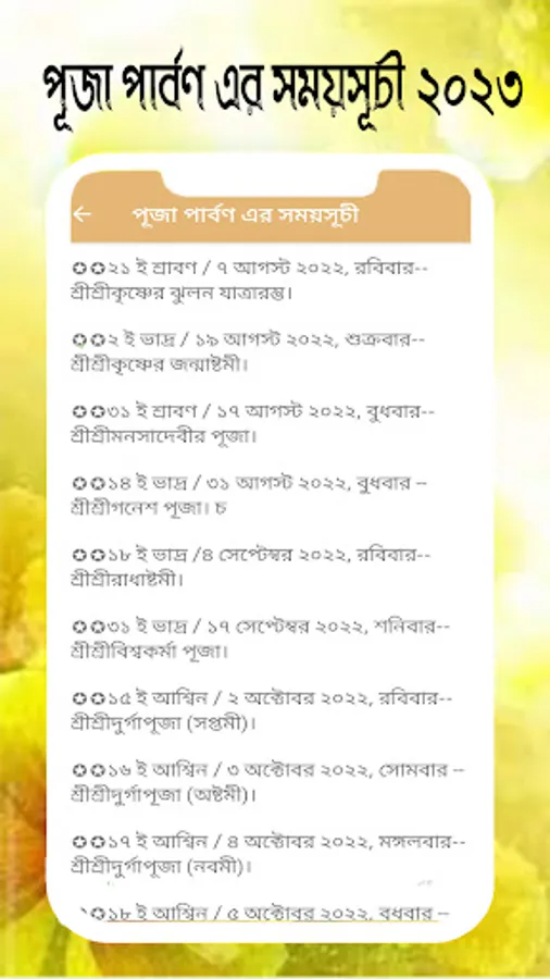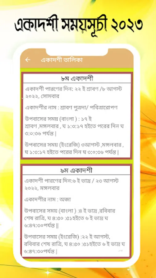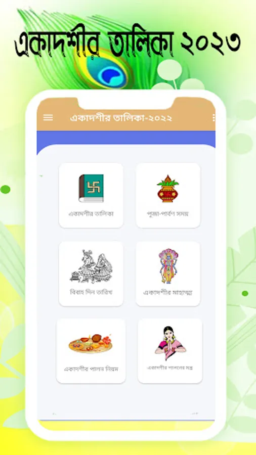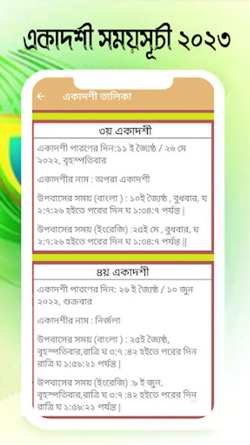 Ekadashi List The app contains Ekadashi list and schedule, wedding date, puja-parvan schedule, Ekadashi Paran mantra. The app uses the date of Bengali month as well as the date of English month. All the information of this app is collected from Loknath directory calendar.