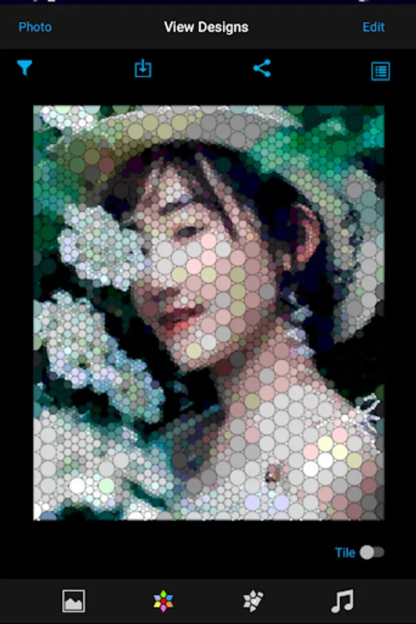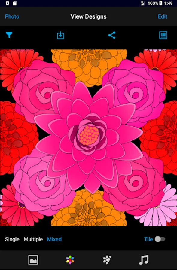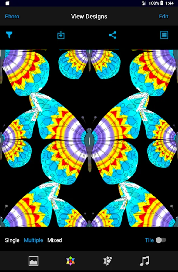 - This view has three modes. Single mode is to view the shapes in the filter (left and right swipe to change shapes). The Multiple mode shows design having multiple instances of the same shape (left and right swipe to change the shape, up and down swipe to change the design). The Mixed mode shows designs containing different shapes (use up and down swipe to view the designs).