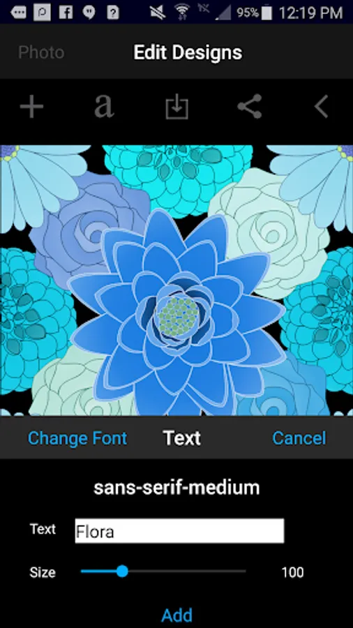 - Touch the "a" icon to display list of fonts. Tap the font and you can enter text and select its size to be added to the design.