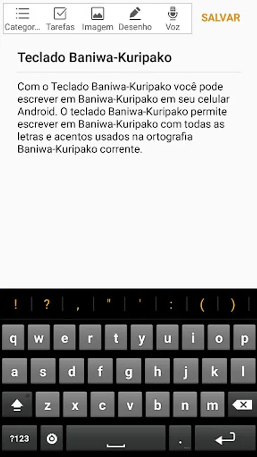 Keyboard specially designed to write the Baniwa-Kuripako language on Android phones. With it you can easily type all the letters used in the Baniwa-Kuripako spelling. The keyboard also allows you to write in Portuguese without having to change the keyboard.
