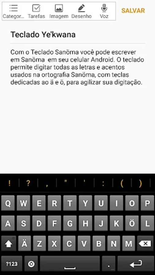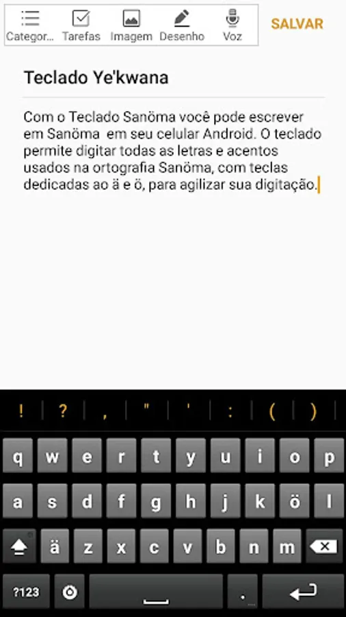 Keyboard specially designed to write the Ye'kwana language on Android phones. With it you can easily type all the letters used in the Ye'kwana spelling, in particular the vowels Ä, ä, Ö, ö, with a key dedicated to each one of them. The keyboard also allows you to write in Portuguese without having to change the keyboard.