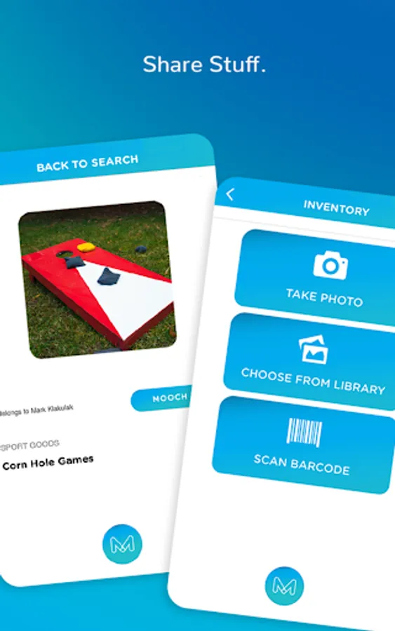 Mooch is a virtual inventory you create with your friends to share stuff you are willing to let each other borrow. Whether it's tools, clothes, books, baby stuff, or anything else, you simply take pictures of things you want to share or use the bar-code scanner to add items to your inventory. Then you simply click on "mooch it" when you want to borrow an item. Mooch will keep track of who borrows items, and also keeps a record when they are marked returned so you are less likely to lose stuff people borrow.