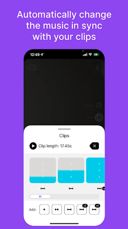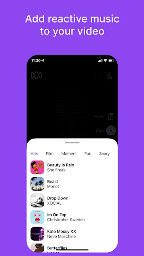 With Moodelizer you will make great sounding videos in no time. Our built-in reactive music editor lets you arrange music as you make your video. Touch the screen while you’re filming and change the music live. Preset your musical arrangement in Clips and shoot a video in perfect sync with your tunes.