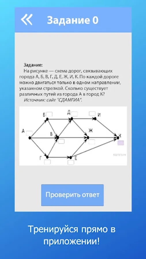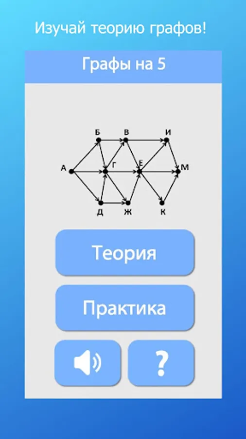 Graphs on 5 is an application that will teach you the theory of graphs: it will teach you how to independently find the number of paths both on a complete graph, with the exception of a point or vice versa, passing through a certain point. This application will be useful in preparing for the unified state exam in computer science, as tasks number 3 and number 15 test the examiner for knowledge of graph theory.