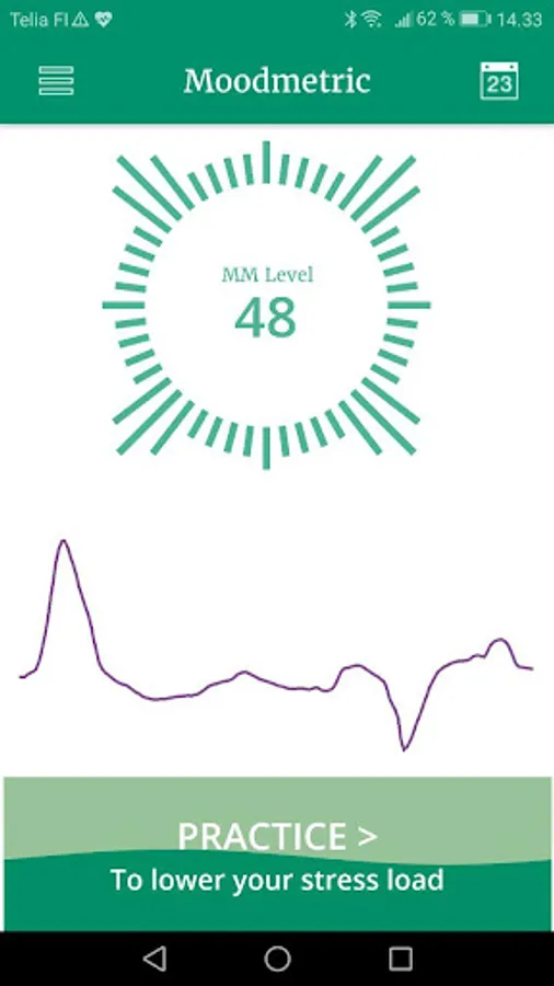 Practice feature records the stress level accurately during a specified time. This feature is meant e.g. for tracking calmness during a relaxation exercise.