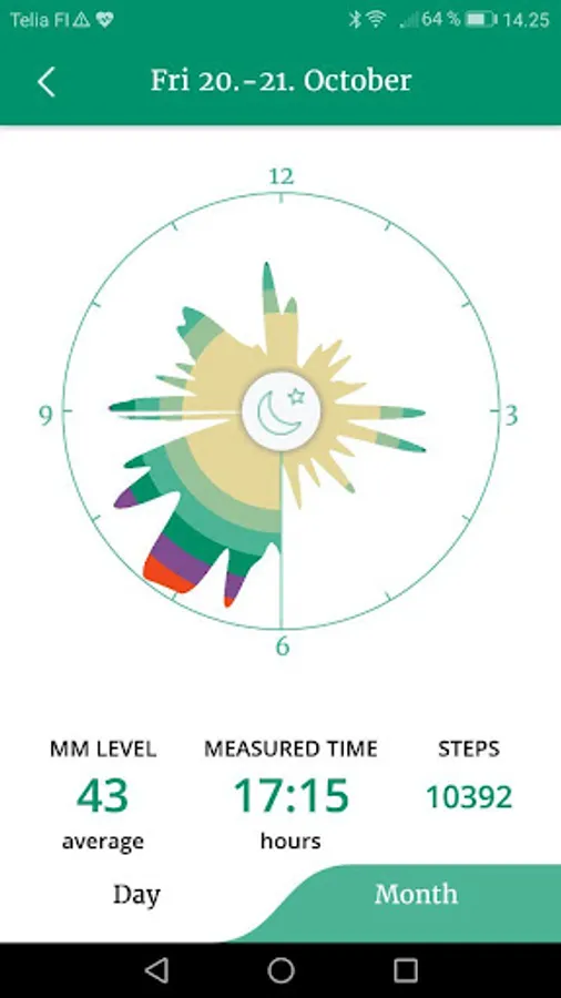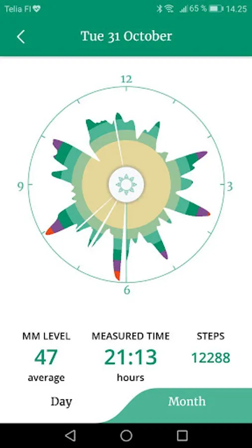 The Moodmetric measurement tells about the sympathetic nervous system activation - the fight-or-flight response. High activation indicates positive or negative stress, low in turn relaxation and calmness. The Moodmetric measurement is intended for long term and continuous follow-up on stress and recovery levels. It shows clearly the impact of emotional and cognitive stress on the overall load. The Moodmetric app works together with the Moodmetric ring and displays the measurement result real-time.