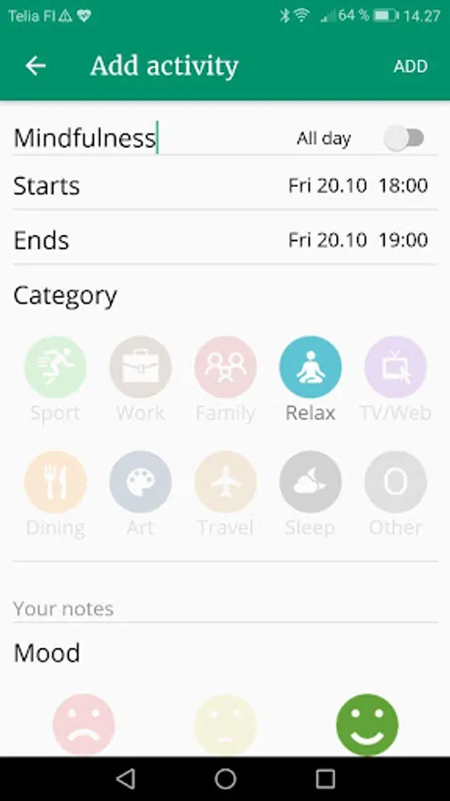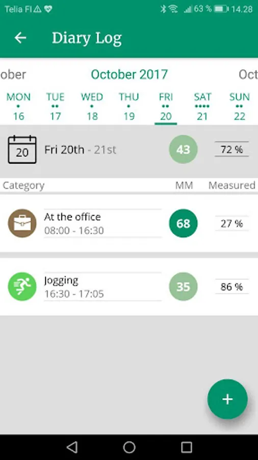 Diary feature lets the user make own notes or import calendar items from the phone. The app specifies the stress level of each item based on the Moodmetric ring measurement.