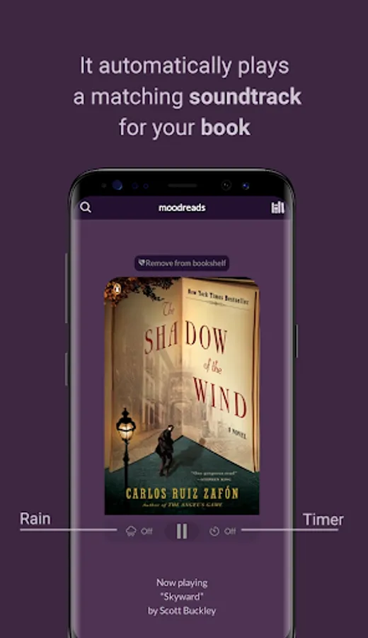 Just type the name of any book into the search bar and BAM! You instantly get a carefully selected playlist that perfectly fits the book you're reading.