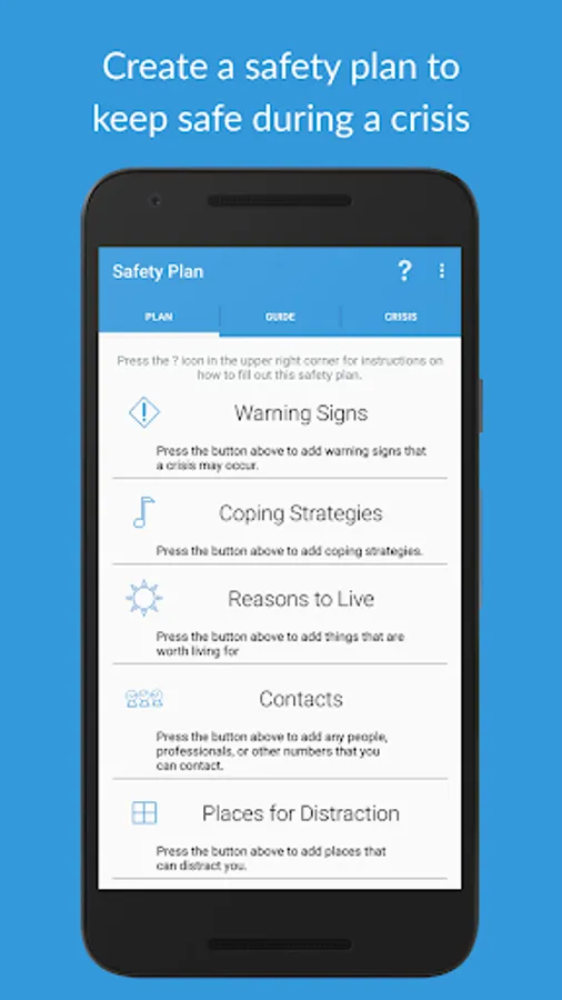In this safety plan app, you can customize your own warning signs that a crisis may be developing, coping strategies for dealing with suicidal urges, places for distraction, friends and family members you can reach out to, professionals you can call, methods of making your environment safe, and your own important reasons for living.