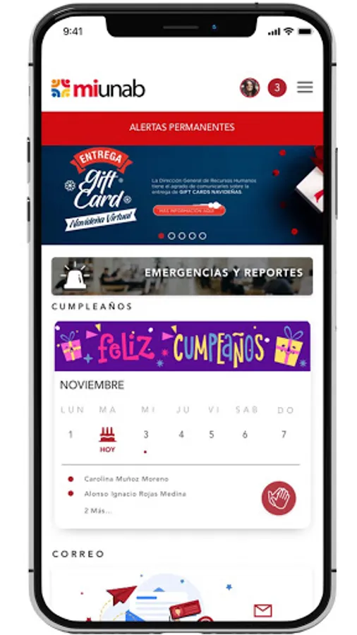 Review information such as regulations, market, see employment opportunities within UNAB, Creation of Reports and Emergency calls, Contacts, Benefits, Services, Surveys and Access to different UNAB services.