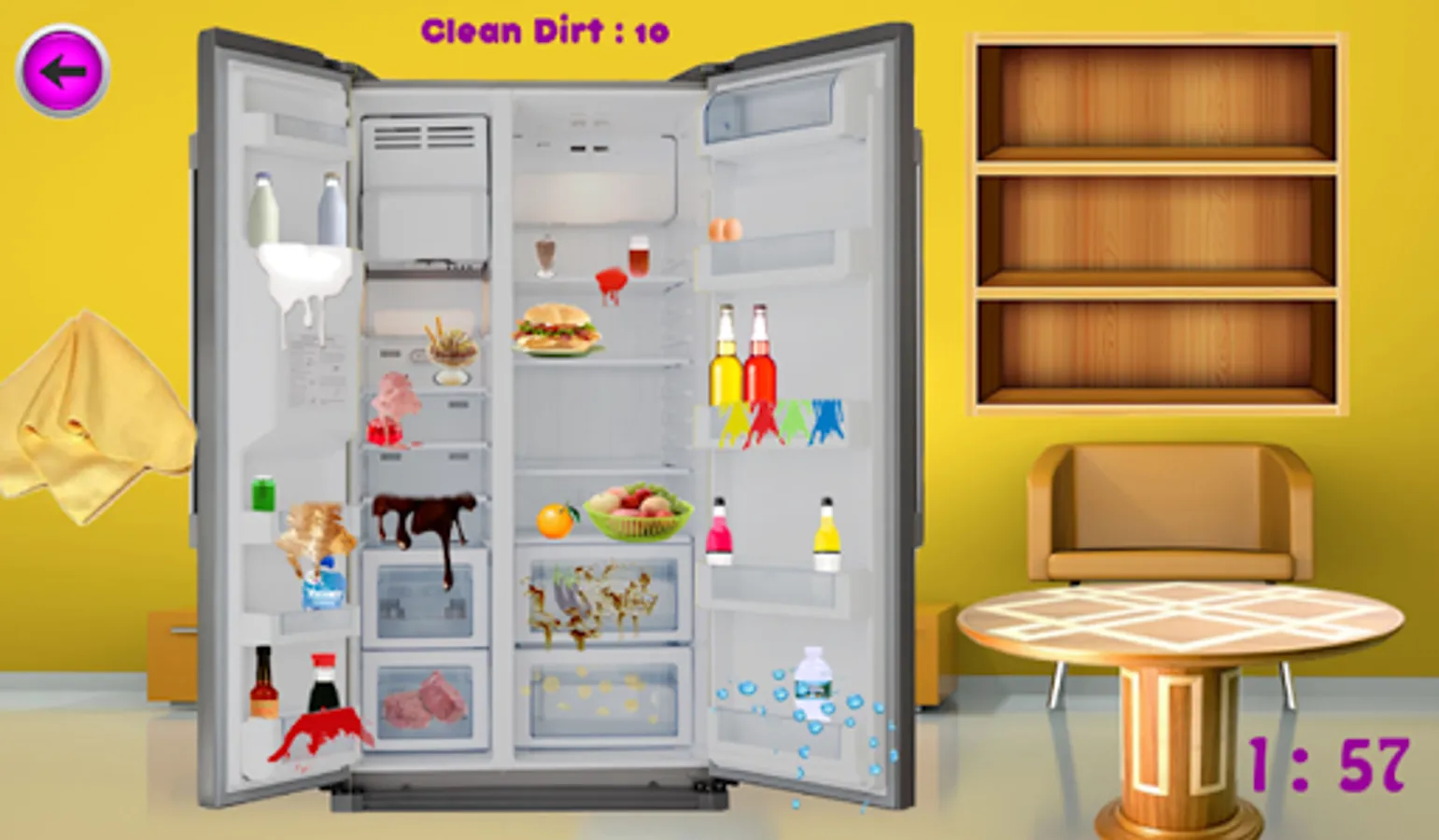 You need to use the freezer because the fridge is full of food, fruits, juices, and drinks. Every time you use the refrigerator when you are hungry. But now the fridge and refrigerator are dirty and should be washed and cleaned. A dirty fridge and freezer can spoil your food, eggs, juices, and other food items. So let's wash and clean the fridge? This girls' cleaning game makes fun of refrigerator and fridge cleaning. Use the water to wash off the dirt and clean the sticky stain with a soapy sponge. Wash off the clay, then dry the water with a towel.
