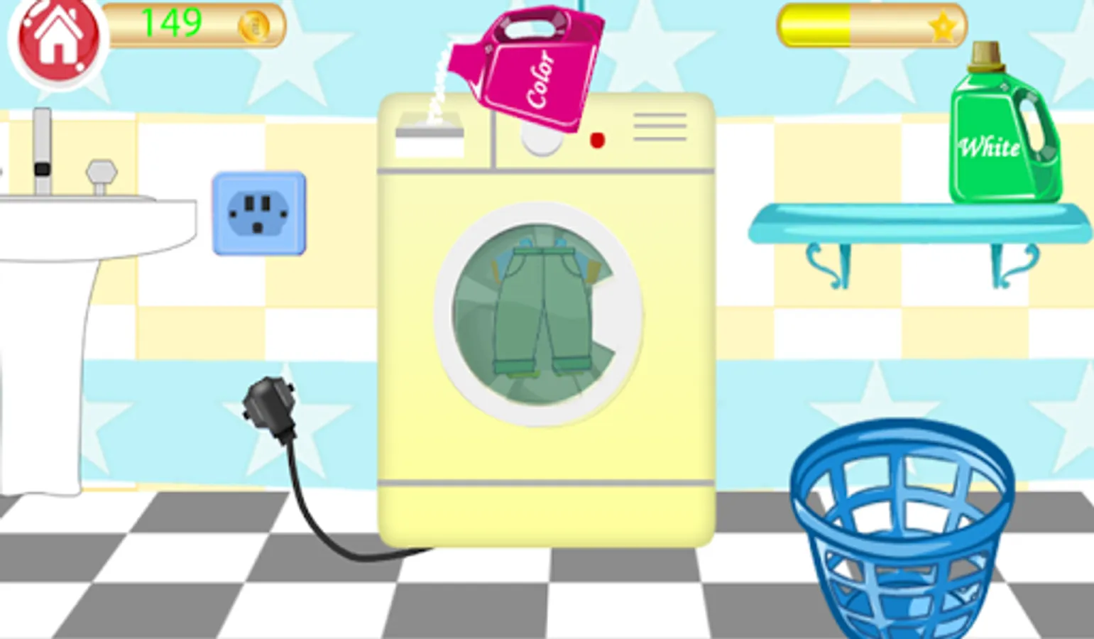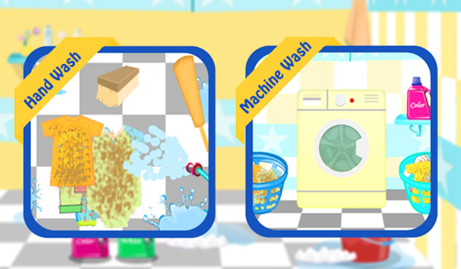 Lets become a mom helper and give the laundry service at home. Washing dirty clothes made fun in this cloth washing game. All family dirty clothes needs washing, wash mom clothes, wash dad clothes, wash girls clothes. You are helping your mommy in her routine work. This laundry game has three main activities cloth wash, Iron Clothes and Hanging Clothes. When doing laundry, separate the white clothes with colored clothes and wash them separately. Wash the dirty clothes using washing powder. When clothes washed then hang it up over the string and let them dry naturally. You have to iron the clothes to give full laundry service.