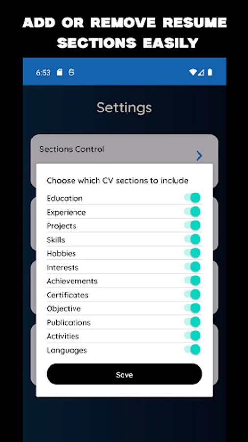 Custom Sections: Add or remove sections like Education, Skills, Experience, and more.