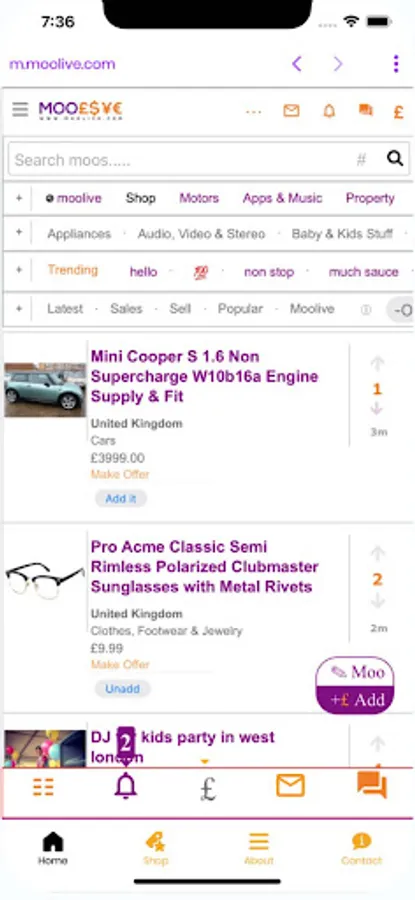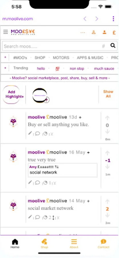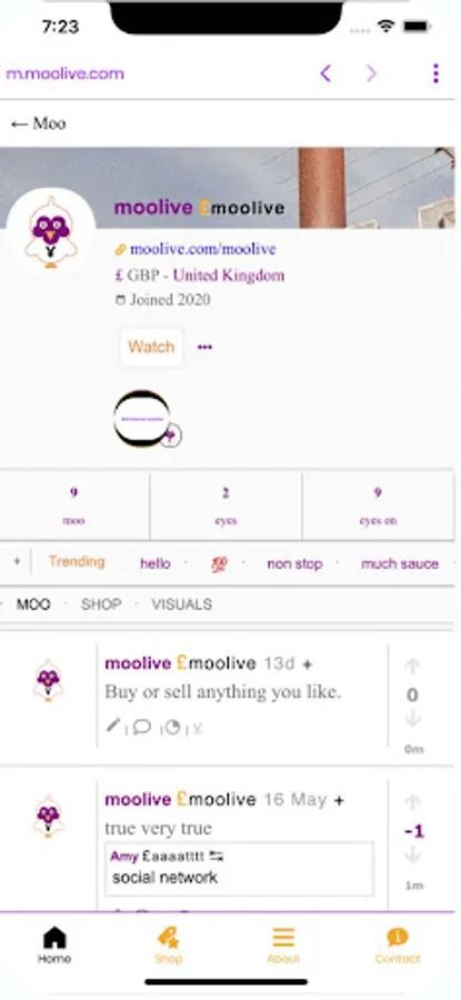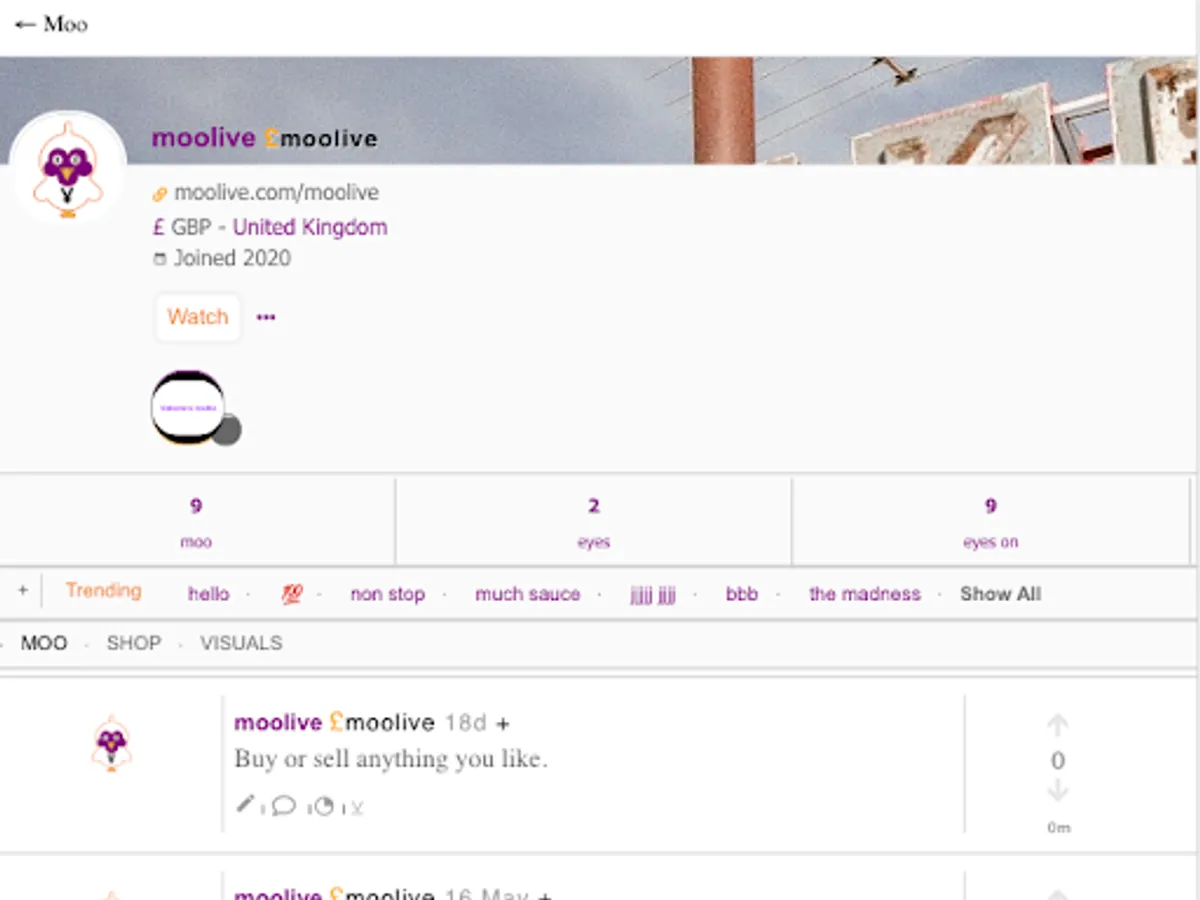 Moolive is a social marketplace where you can connect, trade and interact with others. We are a very small team of less then 5. We plan to create a big team, in the near future, who will help make this site better, bigger and more user friendly. We came up with this idea to help people make money whilst connecting with people globally and enabling them to share content. The site's name was thought of due to the following breakdown: 'Moo' stands for (More Online Opportunities) and 'live' (in regards to live updates). Users will be able to create accounts, post videos, upload photos, upload music, make listings and post products all of which will be labelled as 'Moos'.