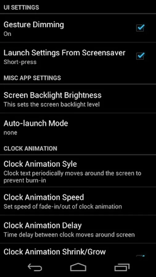 Gesture dimming is set by dragging up and down in the main screensaver mode. Optional UI settings: gesture dimming can be disabled (and will be fixed at current level), choice of long press or short press to get into first settings screen (color settings).