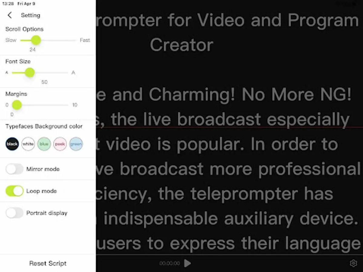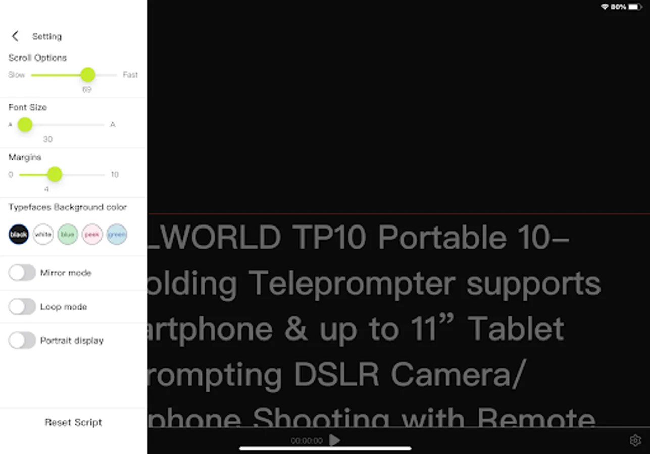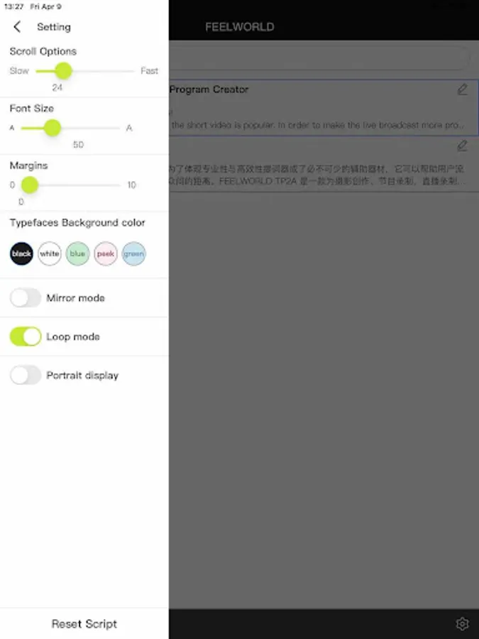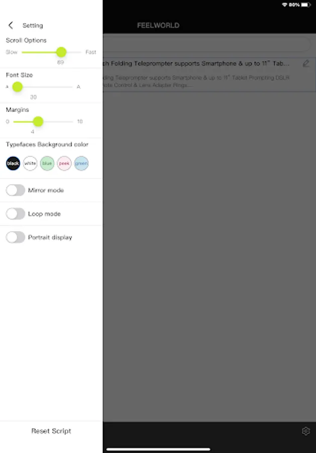 The FEELWORLD Teleprompter app is easy to use,and has all the top requested features turning your smartphone into a high end professional teleprompter.It was designed to be used by itself on a smartphone ,or with the Feelworld Teleprompter.
