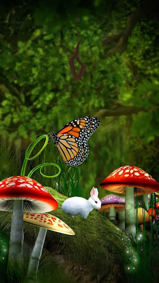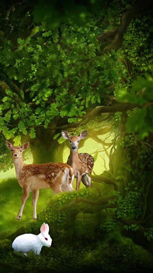 The mesmerizing view of forest live wallpaper with deers,lovely rabbits and mushroom beautifies your phone screen.