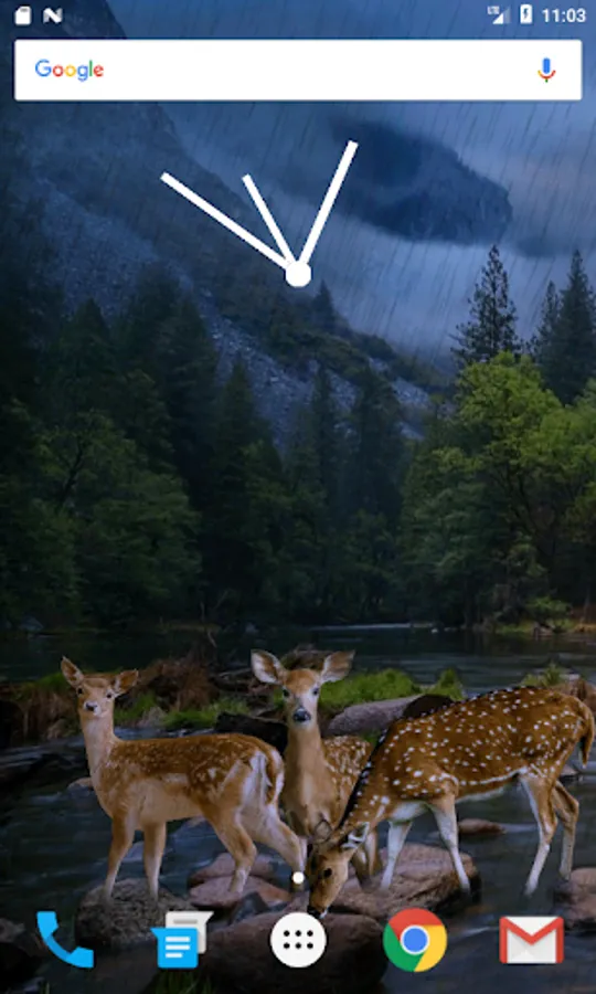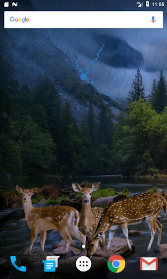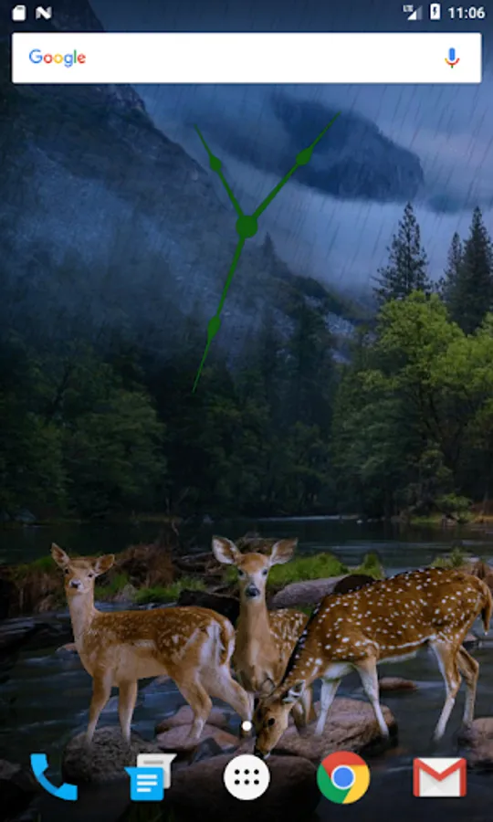 River Deer Live Wallpaper is a free Live Wallpaper which shows the beauty of a forest with three cute deer drinking water from a beautiful river, this live wallpaper has beautiful fog animations too, river in this live wallpaper is having some cute flowing animation, also deer in this live wallpaper has some animations too, there are some mountains in this live wallpaper which are covered by some moving fogs, there are three different clock types in this live wallpaper which are customizable by user, clocks colour, handle type, clock position, all are customizable. Rain in this live wallpaper can be turned off by user also rain speed can be changed, fog in this live wallpaper can be customizable too.