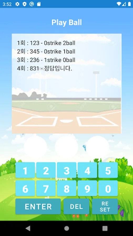 If both numbers and digits are correct, it is recorded as a strike, and if only the number is correct and digits are different, it is recorded as a ball. Get all 3 digits in 9 chances and score!