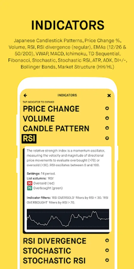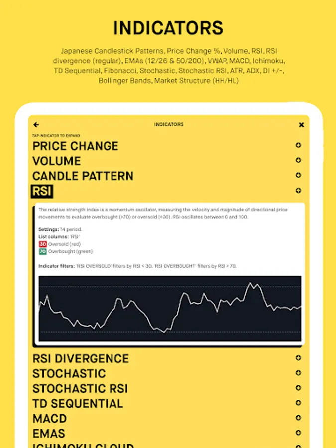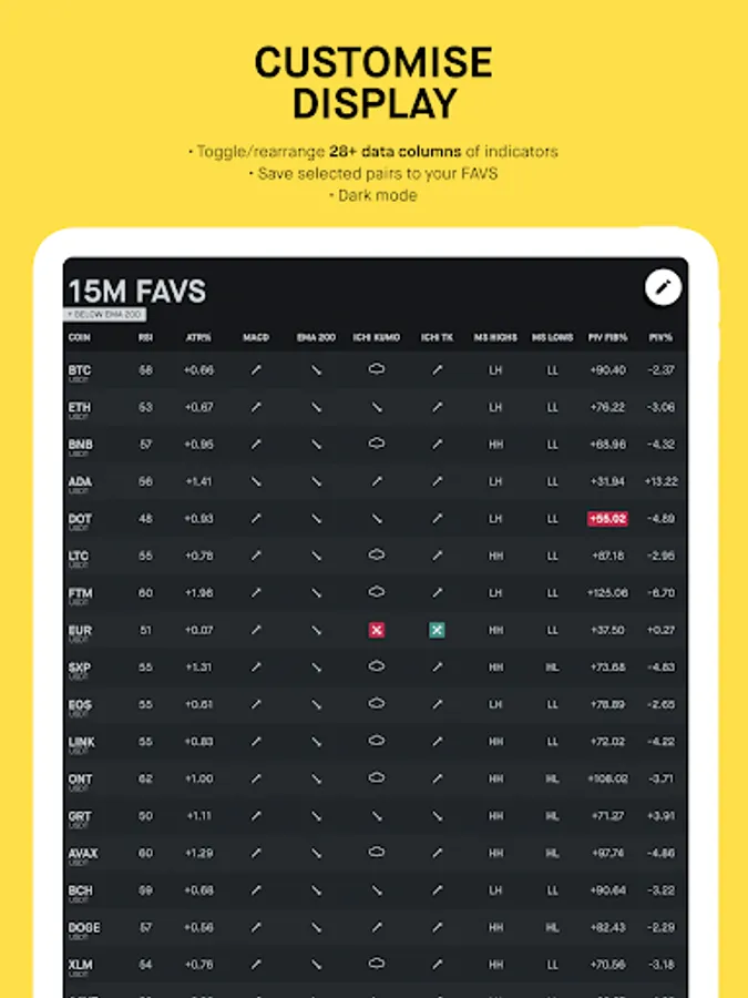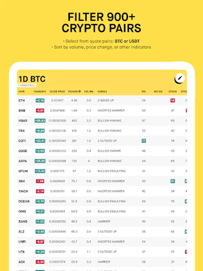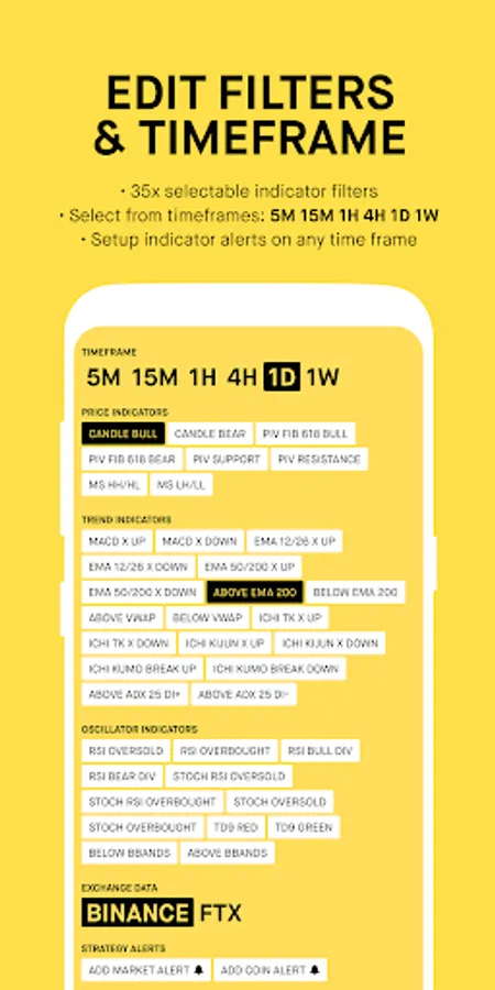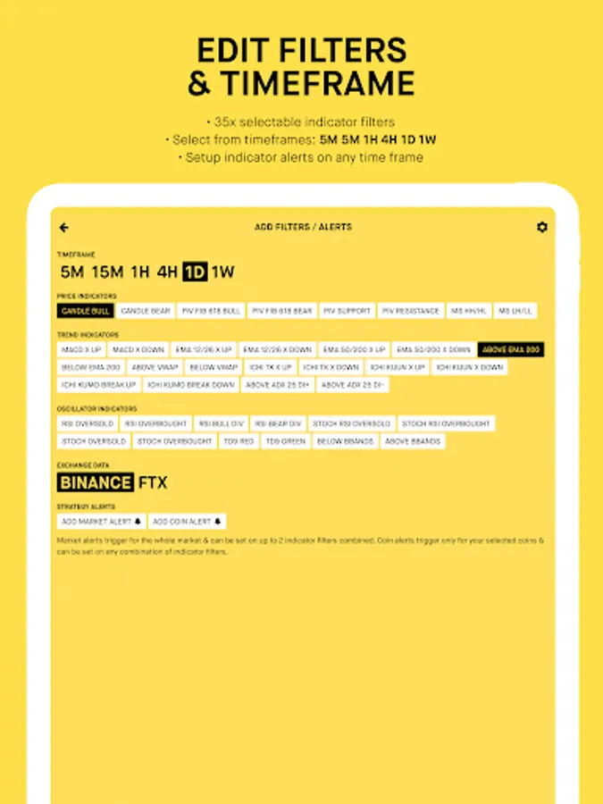 Crypto screener app for traders. Collectively filter 600+ Binance coins by technical indicators and add alerts on different time frames: 5 minute, 15 minute, 1 hour, 4 hour, 1 day, and 1 week.
