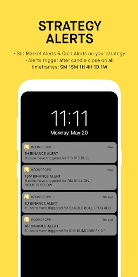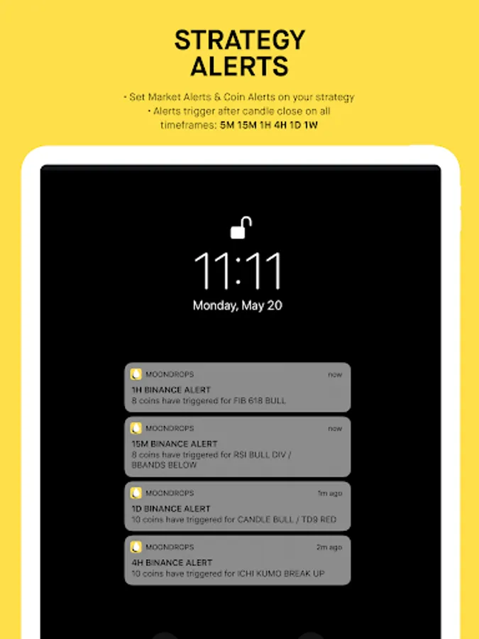 Moondrops monitors 6 timeframes (5M, 15M, 1H, 4H, 1D, 1W) and runs an analysis after each candle close. More than 35+ technical analysis indicators are processed for 600+ trading pairs on Binance. Custom filter alerts are sent to subscribed users, and data is synced to the mobile app.