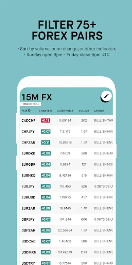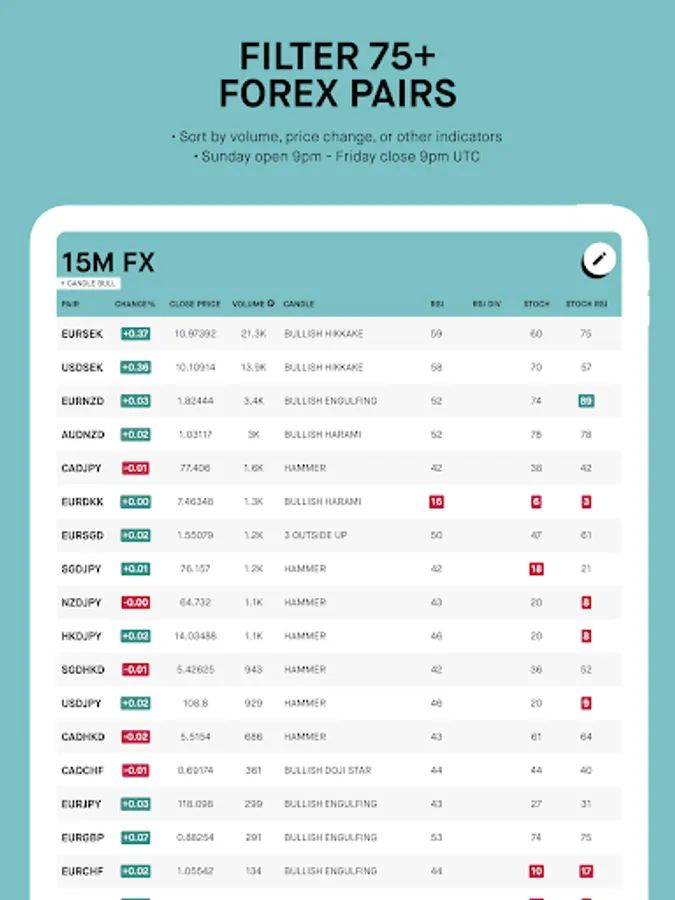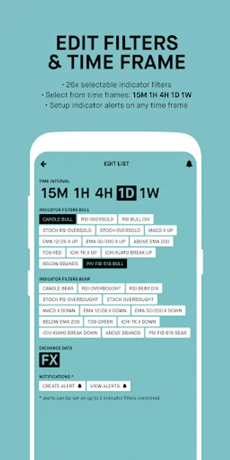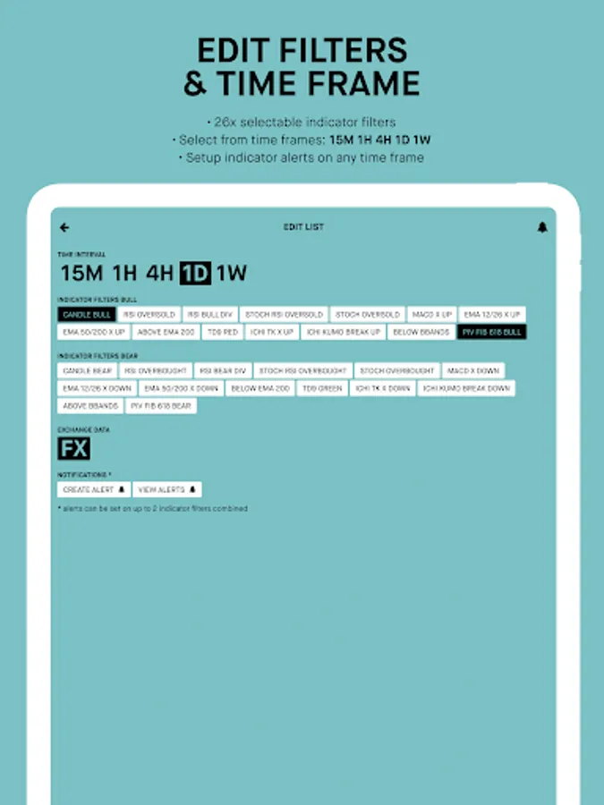 FX screener app for traders. Collectively filter 75+ forex pairs by technical indicators and add alerts on different time frames: 15 minute, 1 hour, 4 hour, 1 day, and 1 week.