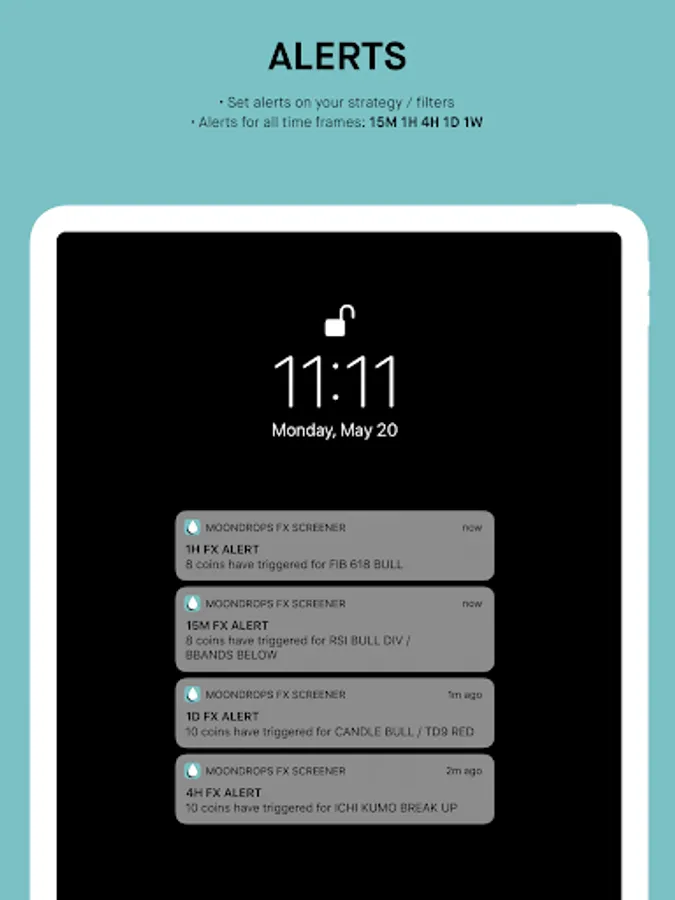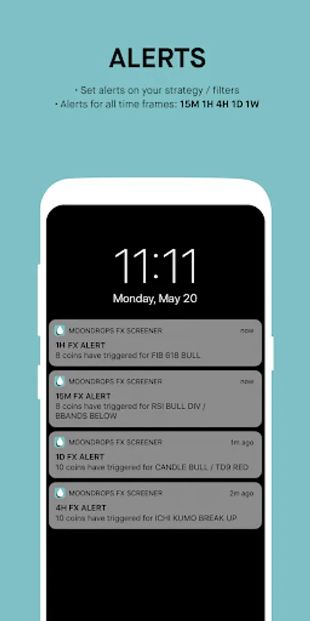 Moondrops monitors 5 timeframes (15M, 1H, 4H, 1D, 1W) and runs an analysis after each candle close. More than 30+ technical analysis indicators are processed for 75+ FX trading pairs. Custom filter alerts are sent to subscribed users, and data is synced to the mobile app.