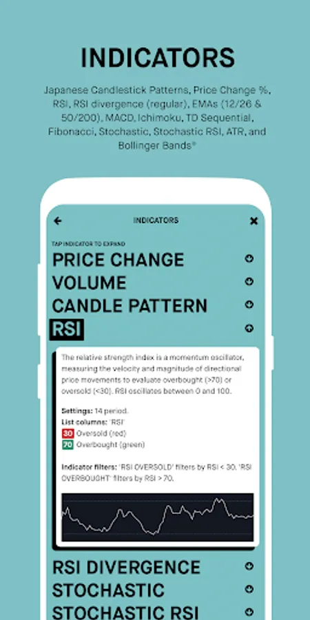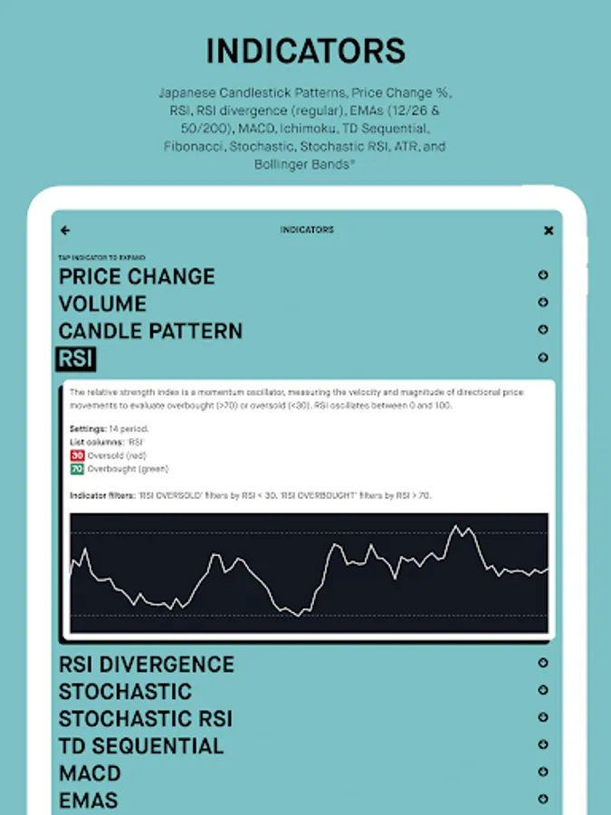 Use the indicator results to sort and filter your list, or combine indicators to create advanced strategies.