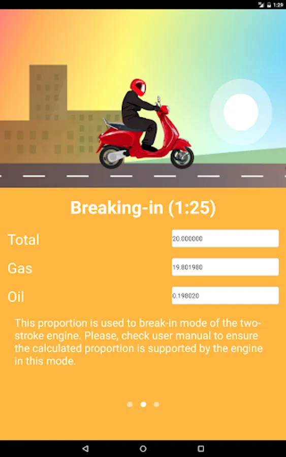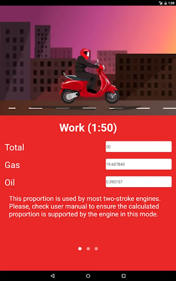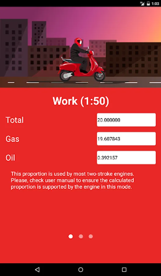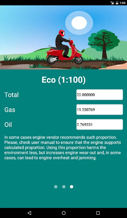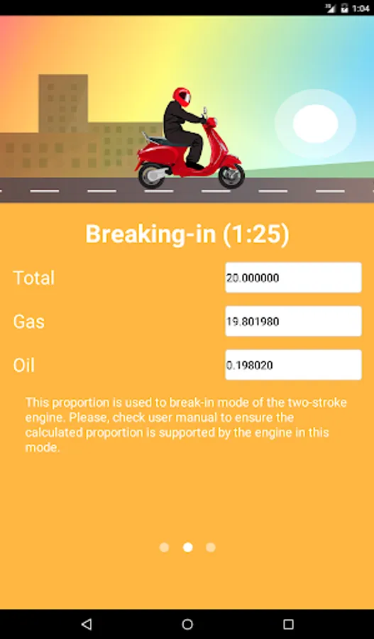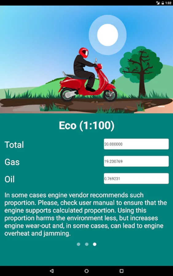 All the information given in the application, is advisory. Please refer to the user manual for your engine to make sure that the motor maintains the calculated proportion of the mixture.