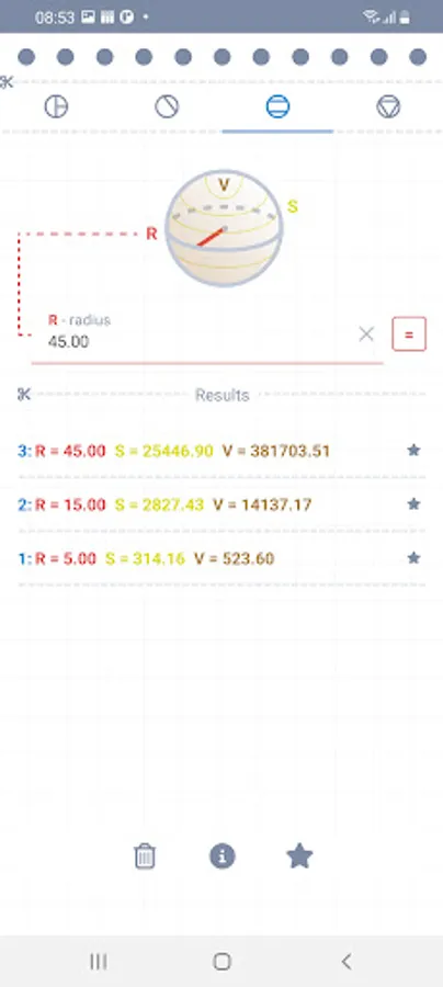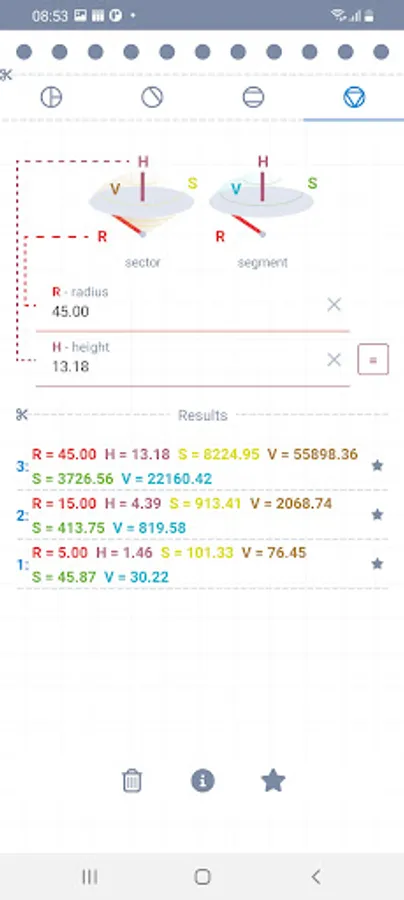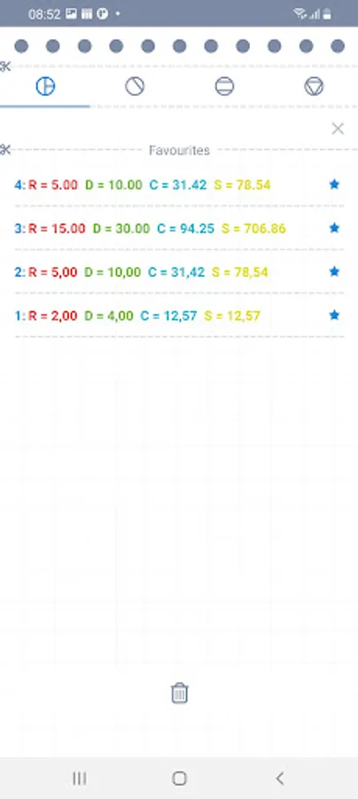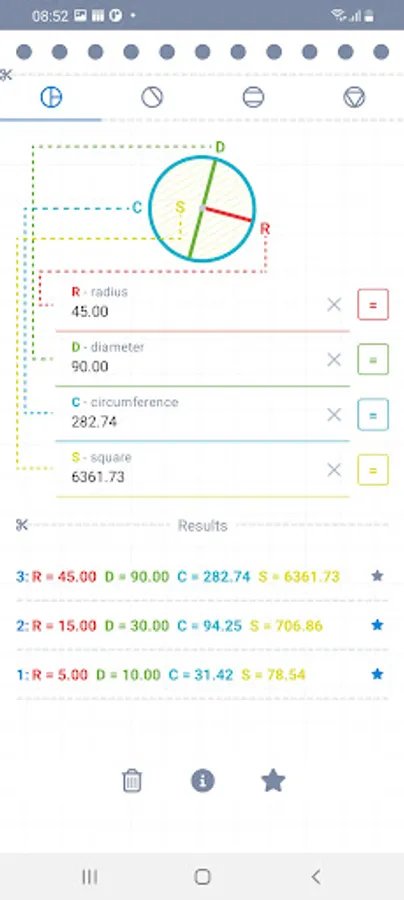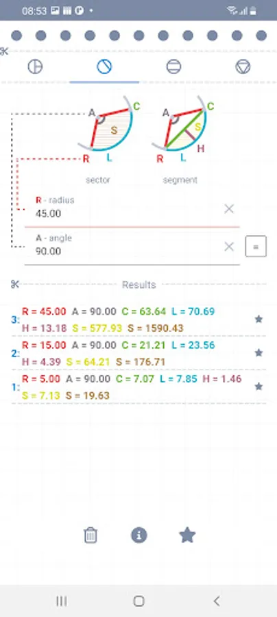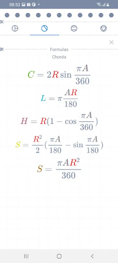 - calculates circle radius, diameter, circumference, area, chorda length, arc length, segment height and area, sector area
