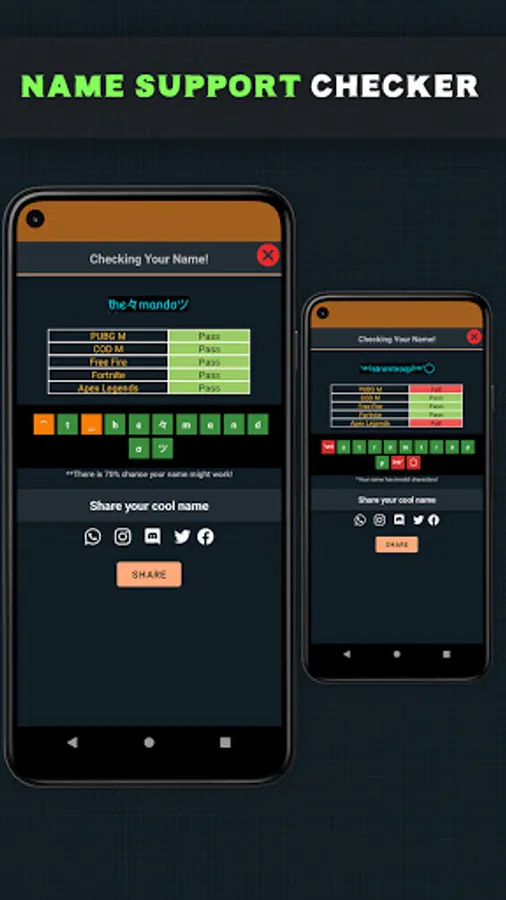 FF Nicks Free nickname maker also has built in nickname checker, it will tell you your names will be accepted in game or not without opening game. Tap copy icon and just Check for PASS ✅ or FAIL ❌ test on your desired game.