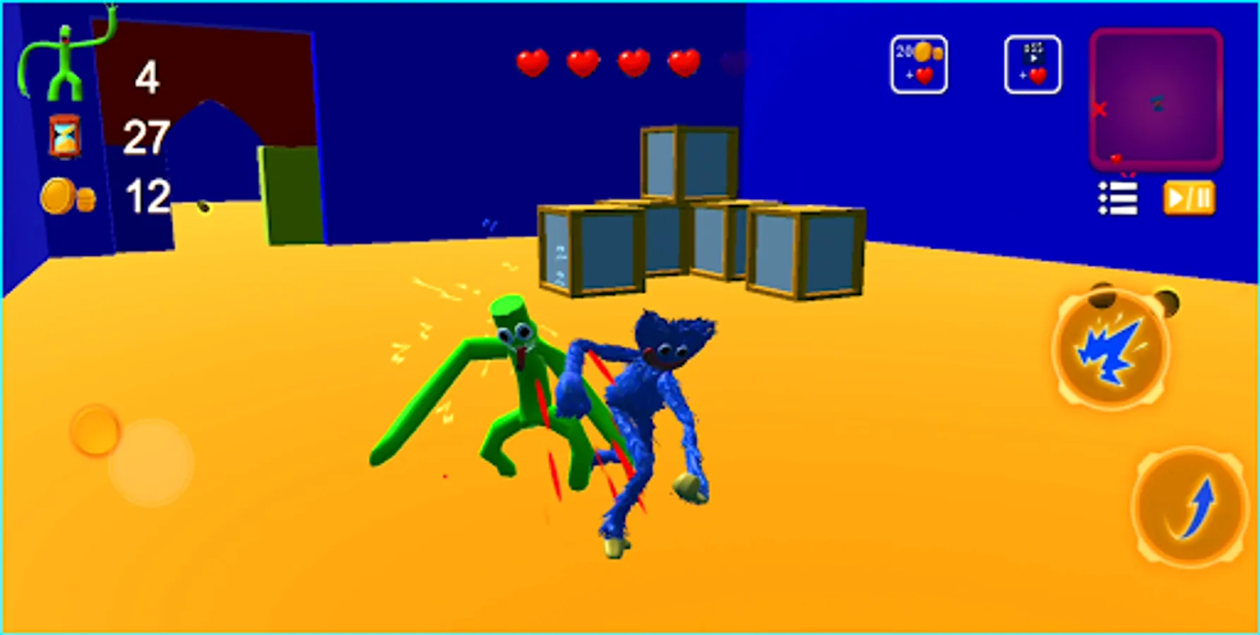 - In the last level huggy poppy tries to defeat the blue Monster Rainbow Friends