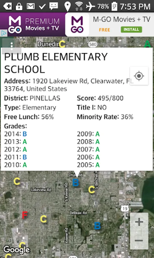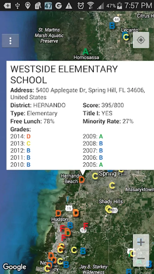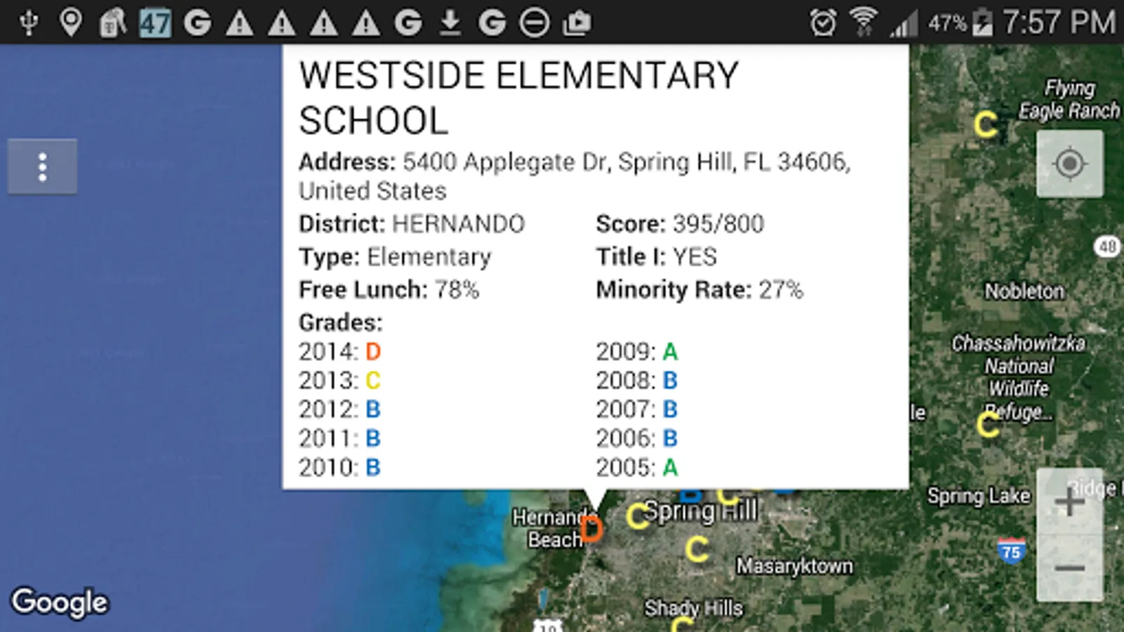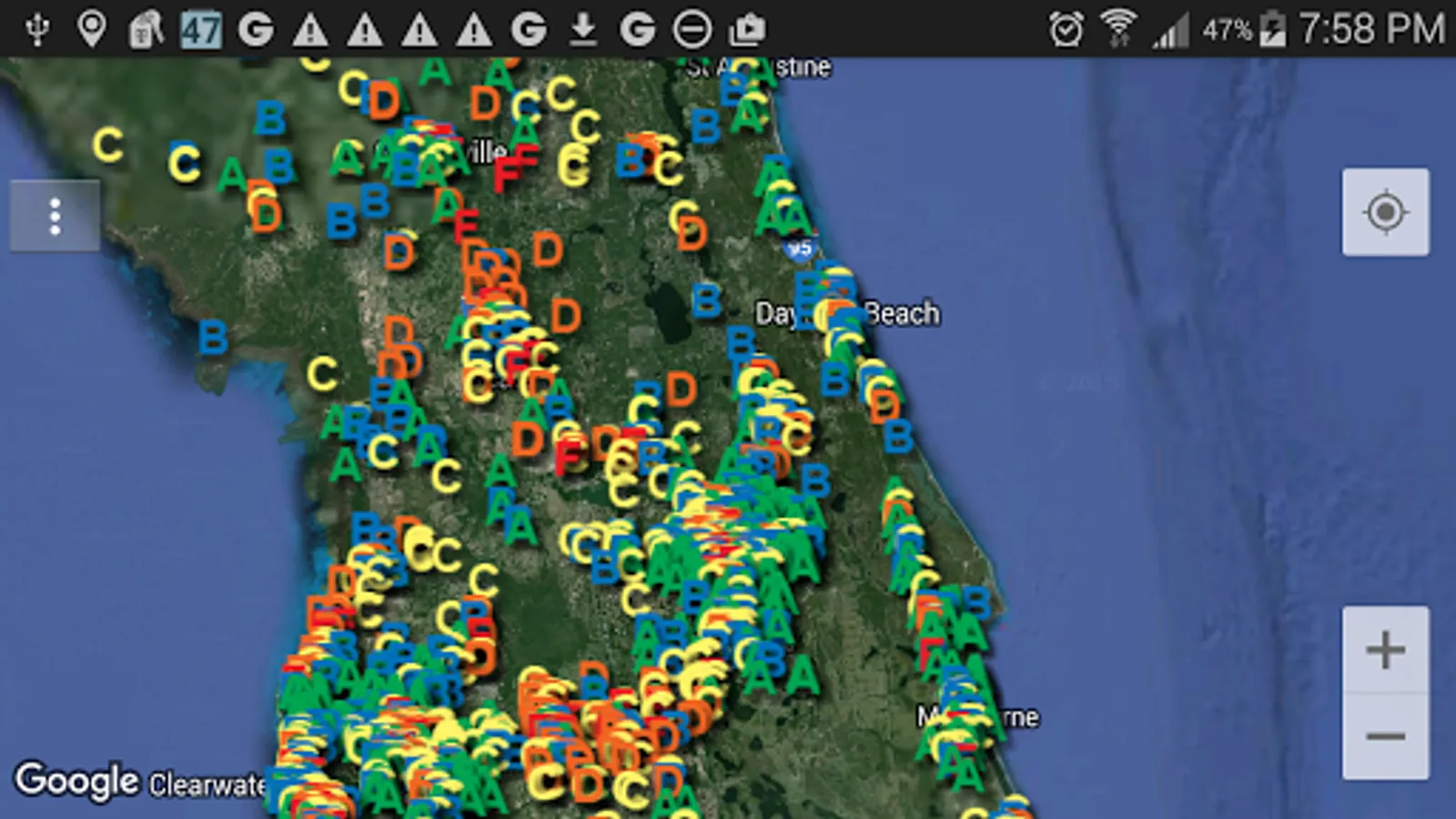 A map showing all Florida public elementry, middle, and high schools along with their Florida department of Education (FLDOE) accountability report grades for the last 10 years. Looking for the best public school in your area? Or getting ready to move to a different area in Florida? This app is a great tool for parents looking for the best school for their children in Florida. We also show other statistics such as the school address, minority percentage and percentage of students getting free or reduced lunched.