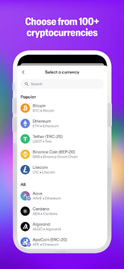 Simply download the app, select a cryptocurrency from the drop-down menu of 100+ coins and enter how much you’d like to purchase in your preferred currency. Simply enter your wallet address and ensure that it's compatible with the cryptocurrency you’re purchasing.