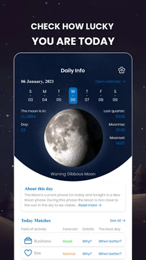 Moon Phase Calendar - Lunar Horoscope is an app that helps you make the most of the moon's energy to choose favorable days for your business and skip the bad times.