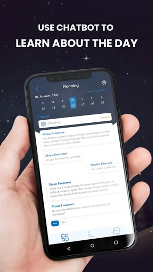 The application gives you a detailed description of each lunar day. The chatbot will tell you how today's lunar day is different, as well as for which areas it's considered good and which it's not. You can learn more details about the current lunar day from the chatbot, or stop the chatbot's narration at any time.