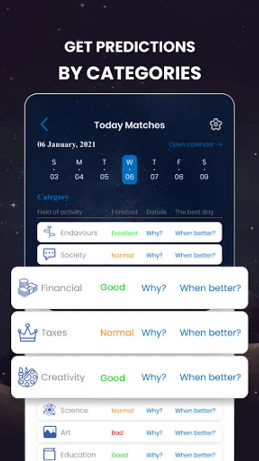 The app is free to select the three categories that are most relevant to the individual user. The app will evaluate prospects and opportunities in the selected categories in terms of the influence of the moon's energy. If you want to receive information about how favorable today's lunar day is for other categories, you can subscribe or watch the ads. There are about 20 categories available to explore, such as finance, job search, creativity, art, and many more.