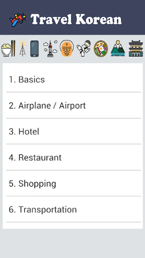 Travel Korean covers a wide range of topics, such as basic expressions, airplane/airports, hotels, restaurants,