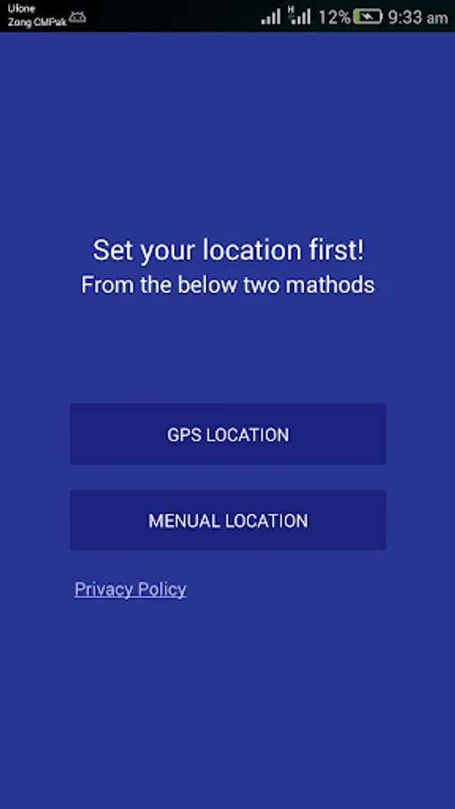 The first screen gets your location for GPS or Internet. After Location the app automatically take you to the moon view screen. If the app is unable to locate you app the user can manually set the location by typing the city name where he/she is and select the location from the list provided.