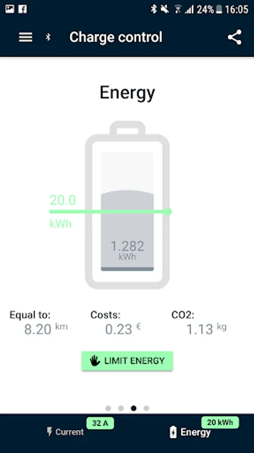 The app allows remote control of the charging power and can access the device integrated energy meter. Keep informed and updated about your charging process! The NRGkick app displays the status of various parameters like voltage, amperage, power and energy. You can directly modify your charging current during charging in 1A steps from 6A to 32A. Charging costs, average energy consumption, mileage, CO2 savings and other useful information is evaluated and recorded.