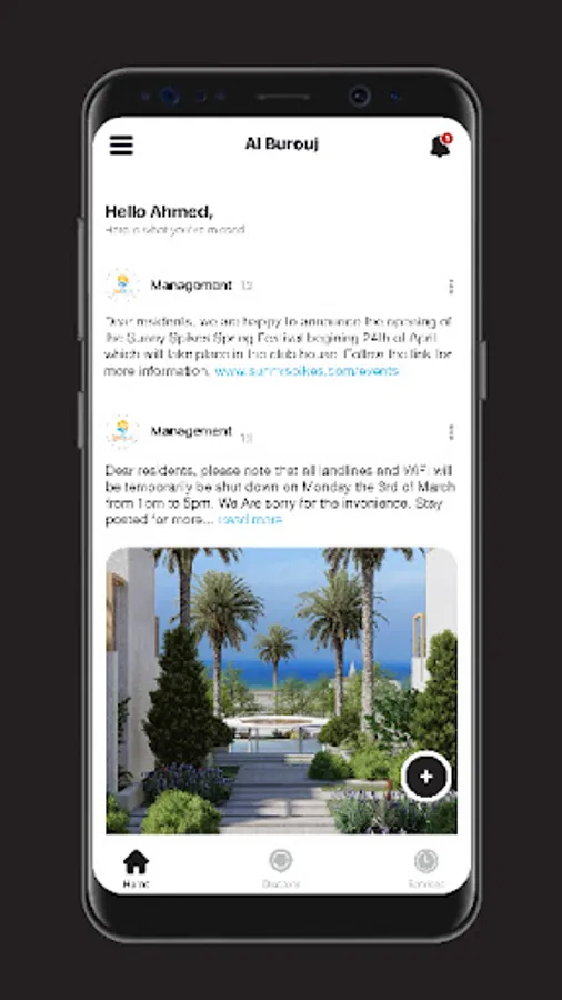 An all in one solution, ALBUROUJ App provides you with everything you need from ordering services, communicating with your neighbors, effectively and instantly reaching the community management to providing you with your unique identity badge for access control and managing your guests invitations.
