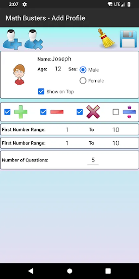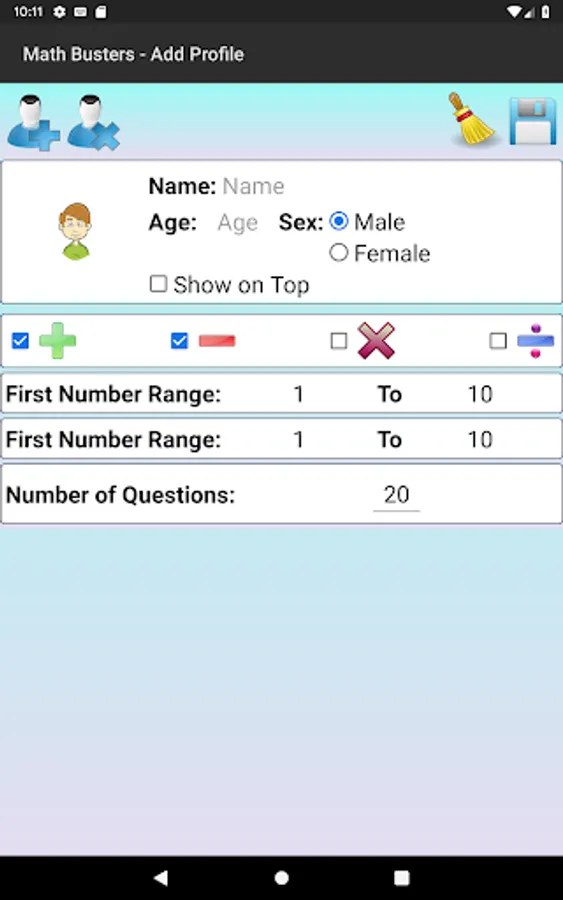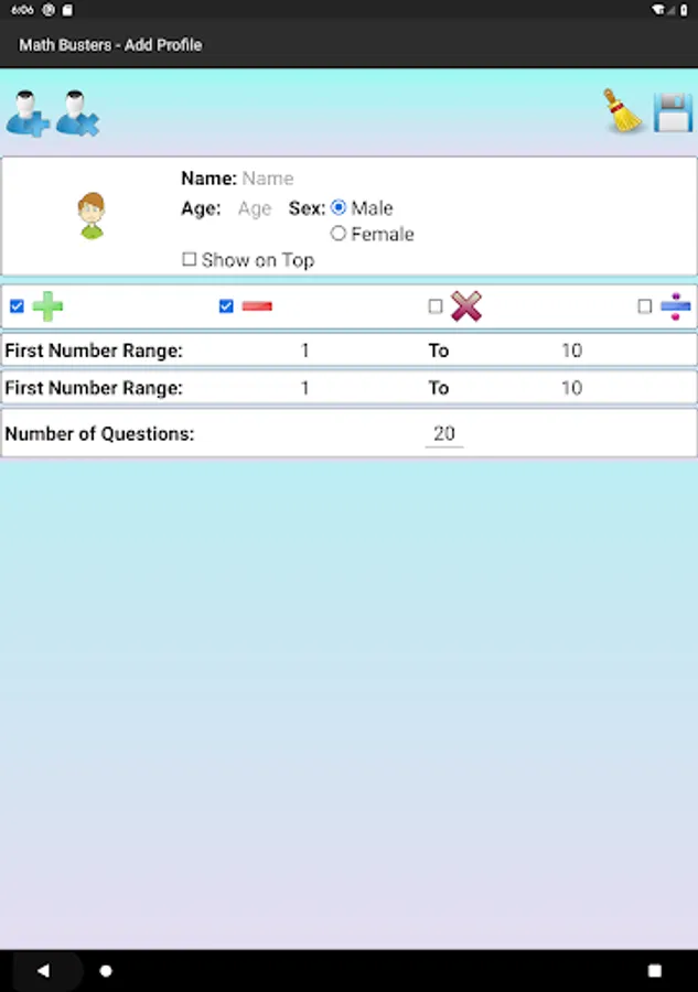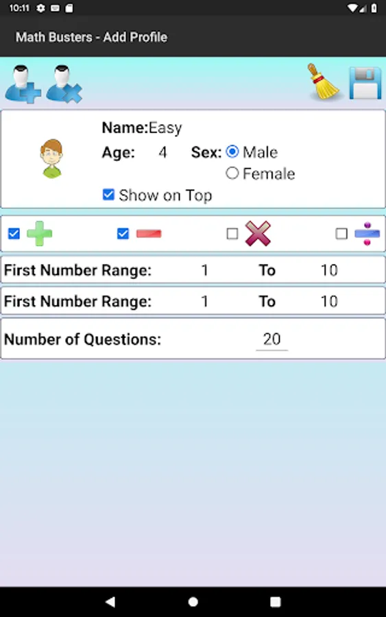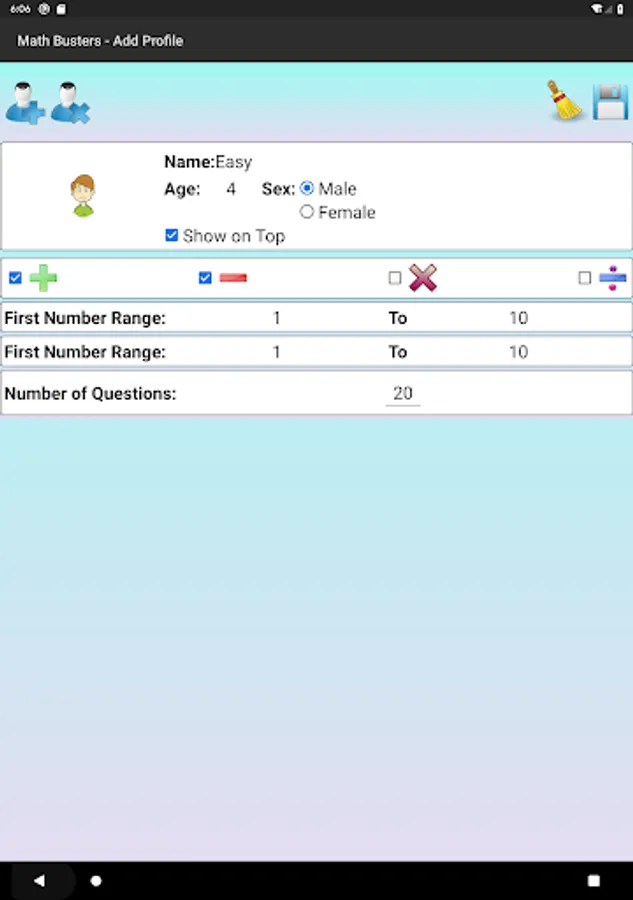 The number ranges, mathematics operations (+, -, *, /) and the number of questions can be saved individually for each user. You can set just addition for your 4-year-old kid and addition and subtraction for your 6-year-old kid.