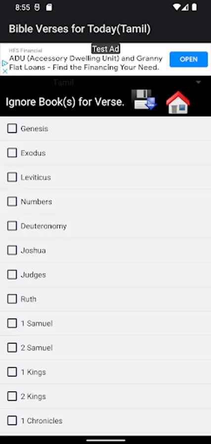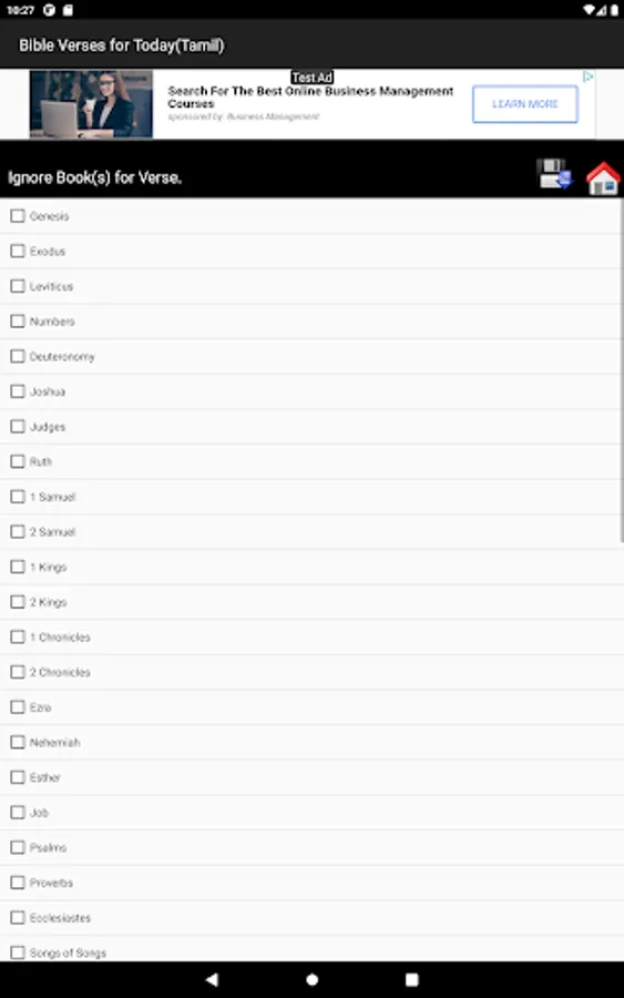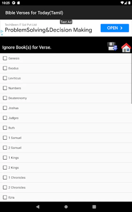Sometimes you may like to read more verses from certain books. So if you like to ignore some books, you can do that on the settings page. Just click the button to open the Settings page. You will see all the books. You can check the boxes against the books you like to ignore. When you save it the app will generate another set of words ignoring the books you selected.